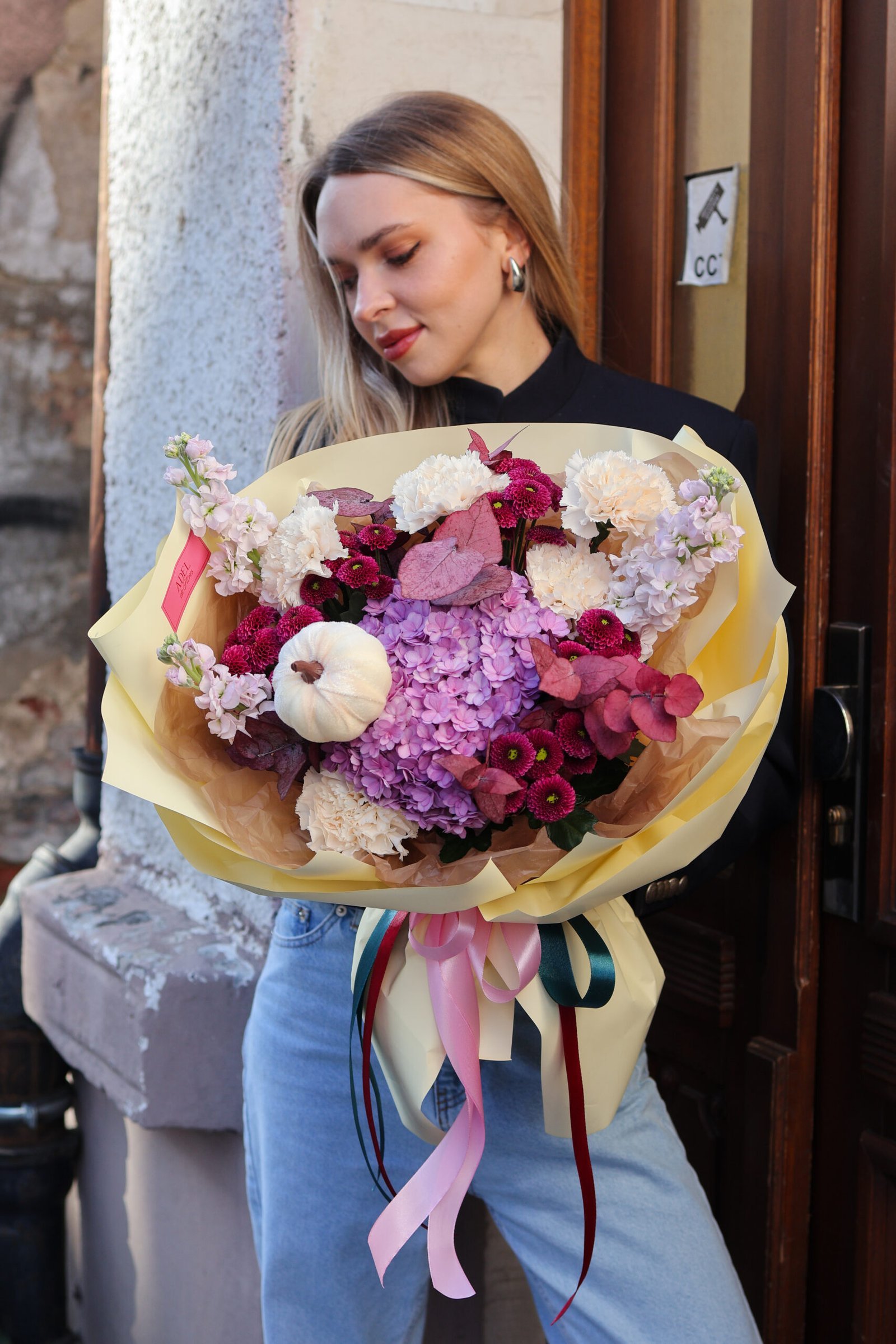 Bukiet z bordową hortensją, różami, kaliami i lewkonią