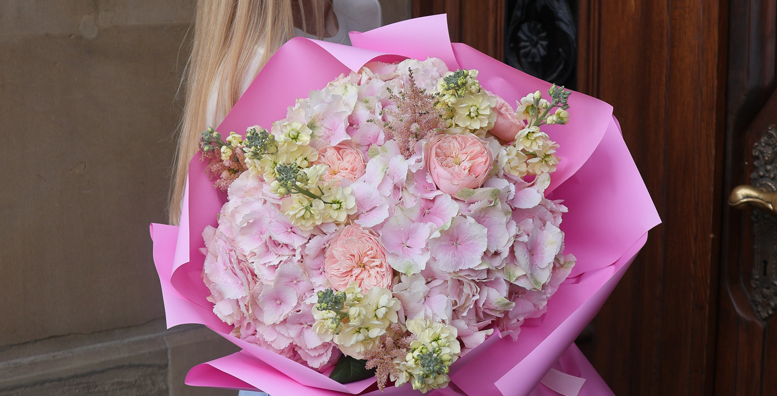 Bukiet z hortensjami, goździkami i różą