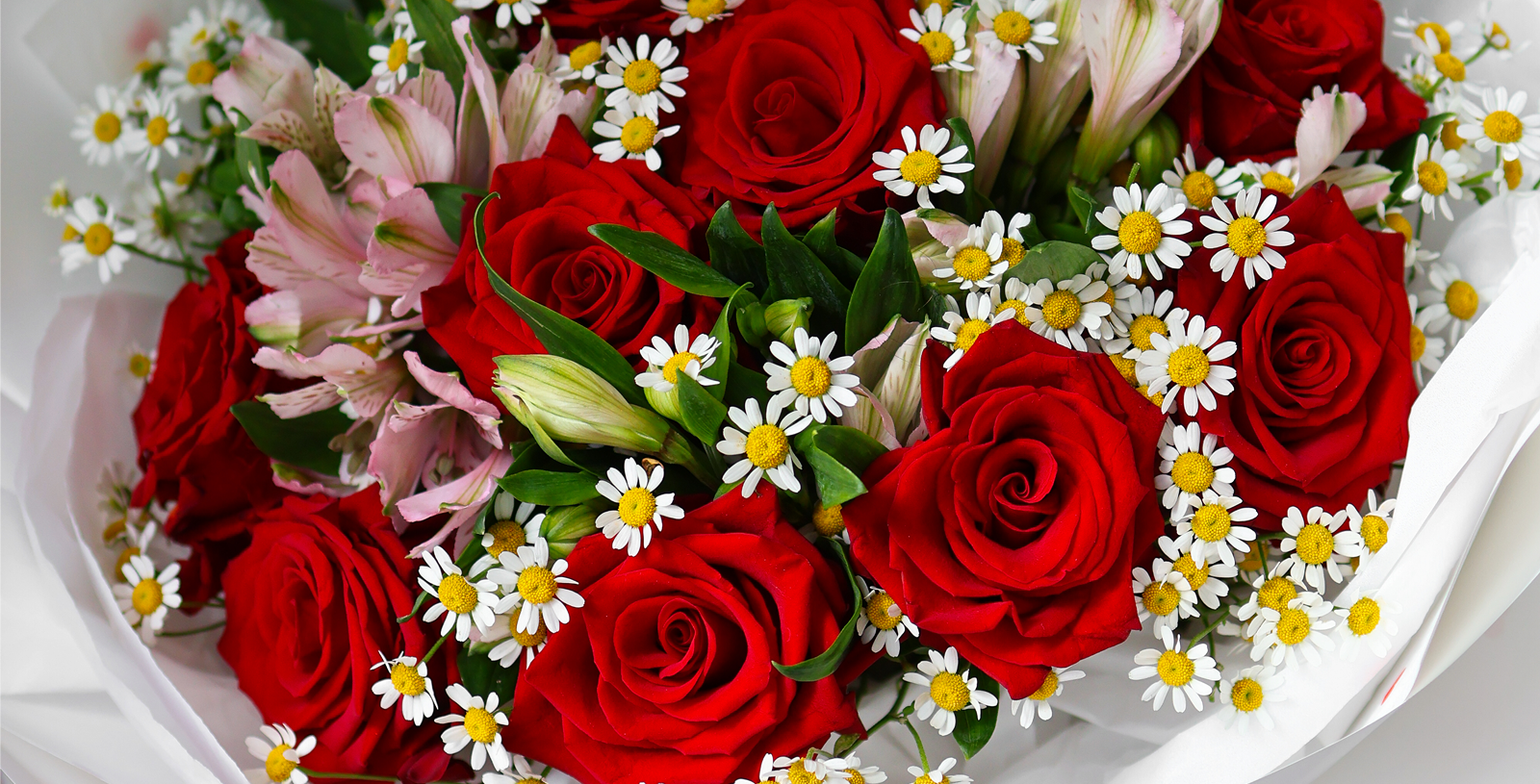 Bukiet z róż, rumianku i alstromerii