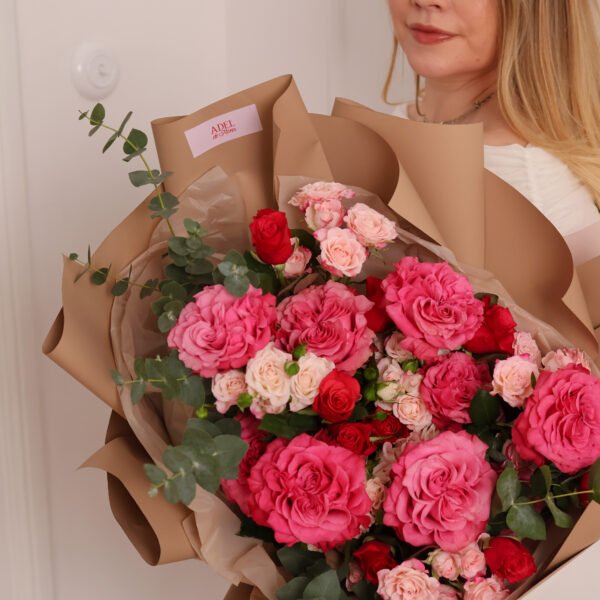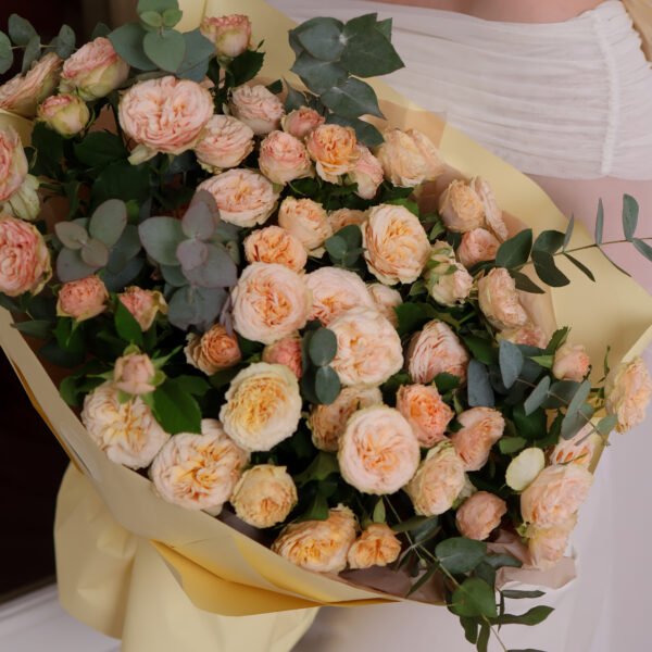 Bukiet z piwoniowej róży Gentle Trendsetter i eukaliptusa