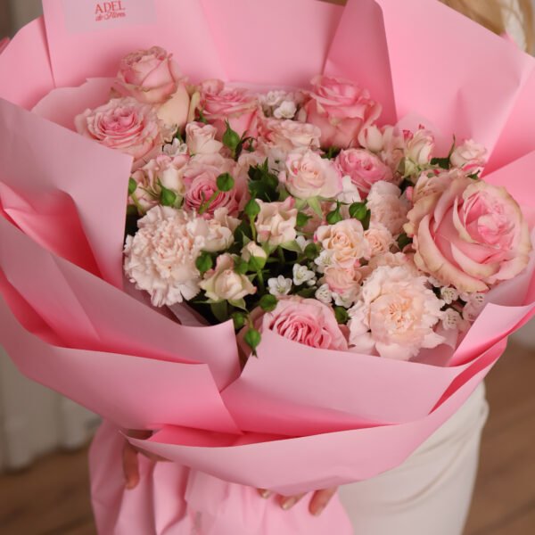 Bukiet z różowych róż, czarnych róż i gipsówki