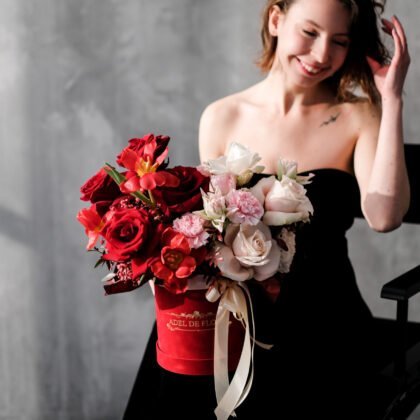 25 czerwonych ekwadorskich róż w eleganckim firmowym czarnym pudełku