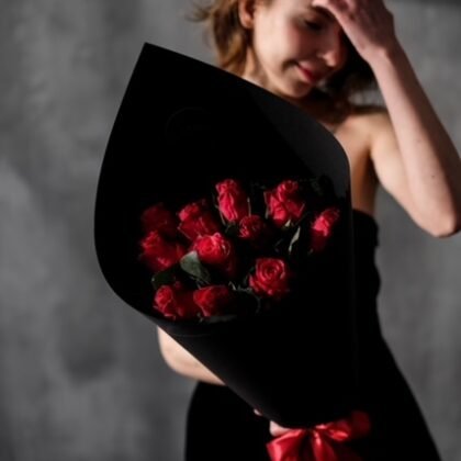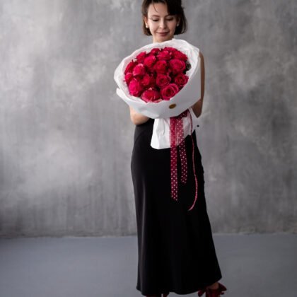 Bukiet z 33 czerwonych róż w czarnym rożku