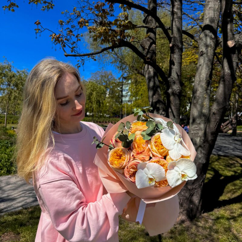 Elegancki bukiet z róż piwoniowych i orchidei