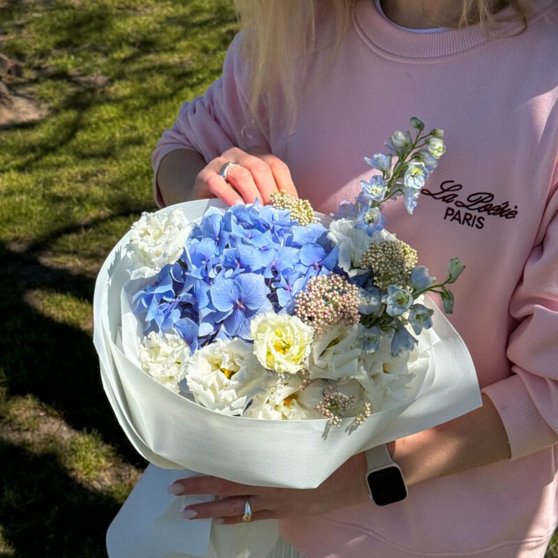 Bukiet z hortensjami, delfinium i eustomą