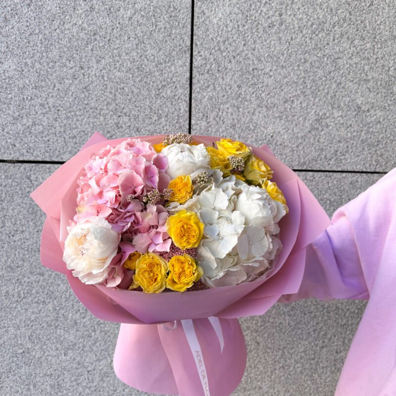 Bukiet z hortensjami, piwoniami i różami gałązkowymi