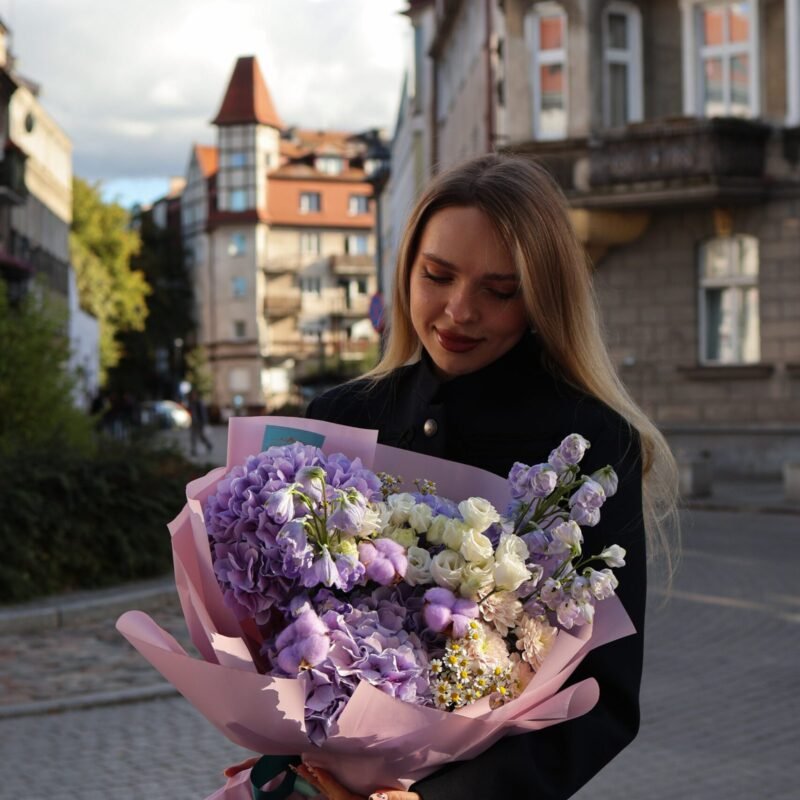 Bukiet z fioletowych hortensji, róży, lewkonii i delfinium