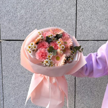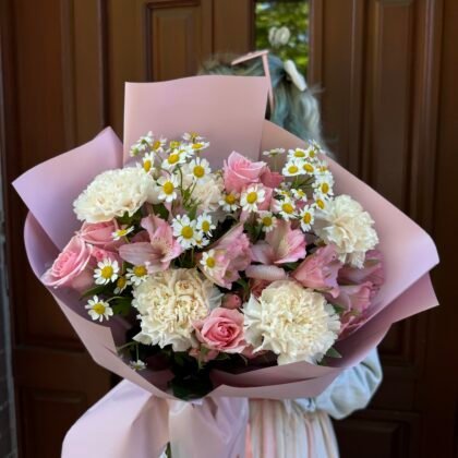 • Bukiet z róż gałązkowych, goździków i alstremerii
