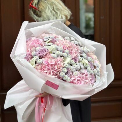 • Bukiet z różowych hortensji, fioletowych róż i kalii
