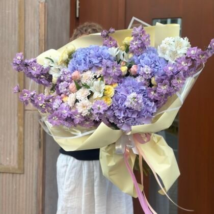 Bukiet z fioletowych hortensji, róży, lewkonii i delfinium