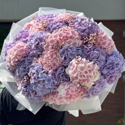 • Bukiet z fioletowych i różowych hortensji oraz gipsówki