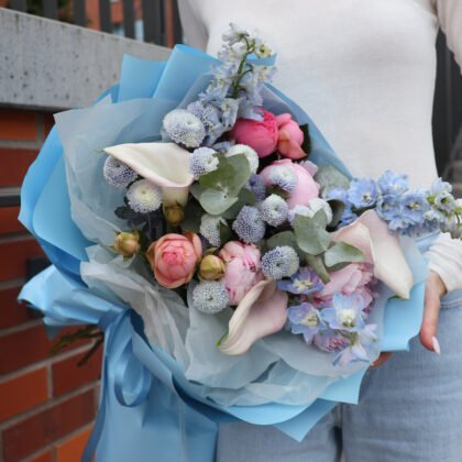 • Bukiet z kalii, delfinium, róż piwoniowych i eukaliptusa