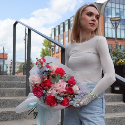 Bukiet z róż piwoniowych, hortensji i delfinium