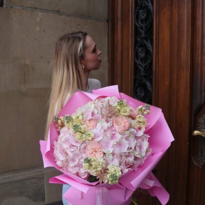 • Bukiet z hortensjami, piwoniami i różami gałązkowymi