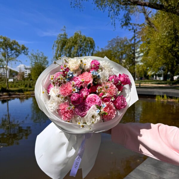 Bukiet z róż gałązkowych, goździków i alstremerii