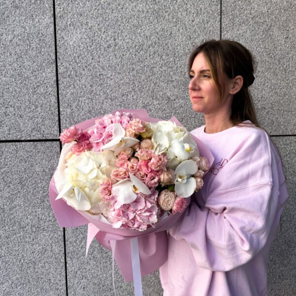 Bukiet z hortensjami, orchideami i różami gałązkowymi