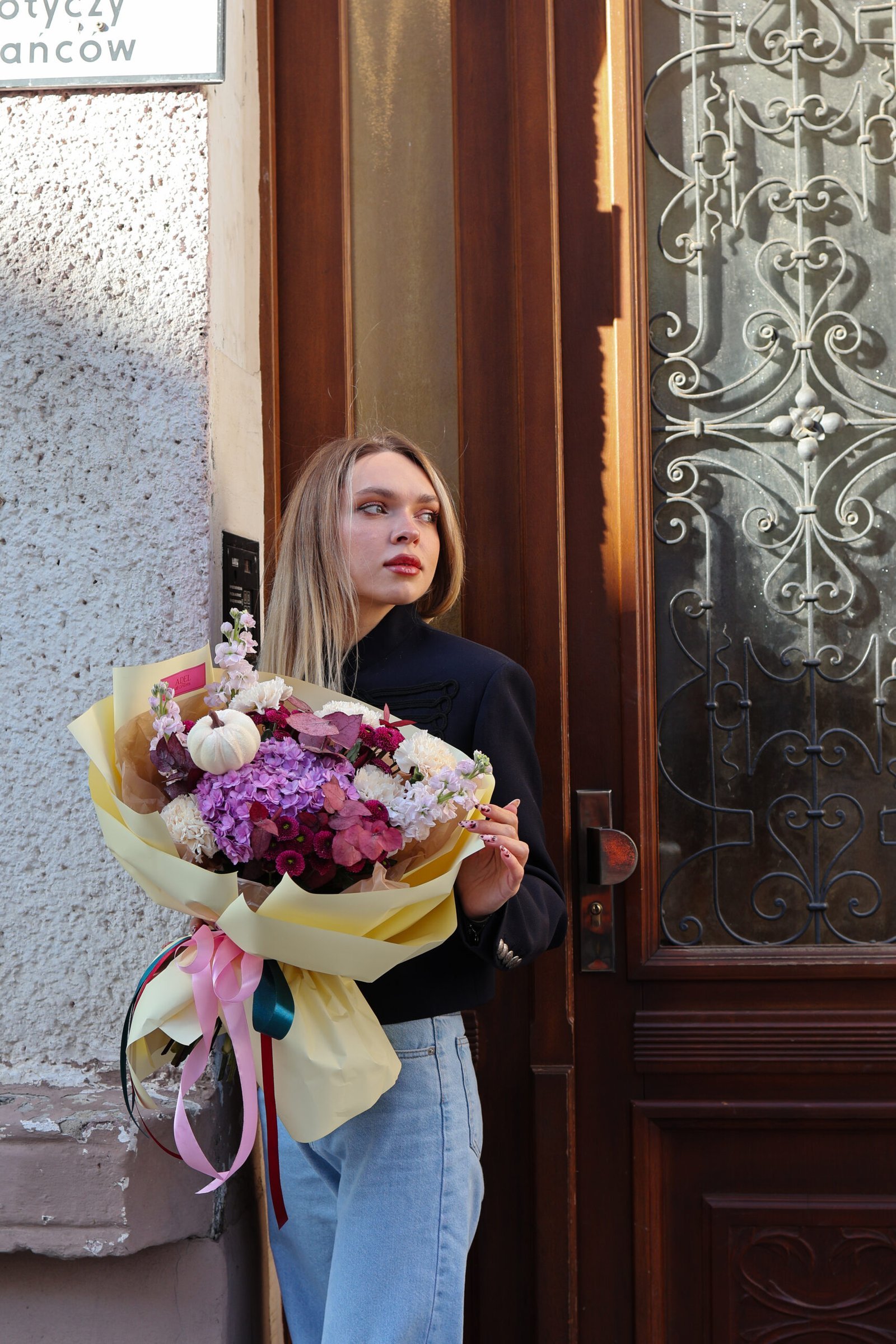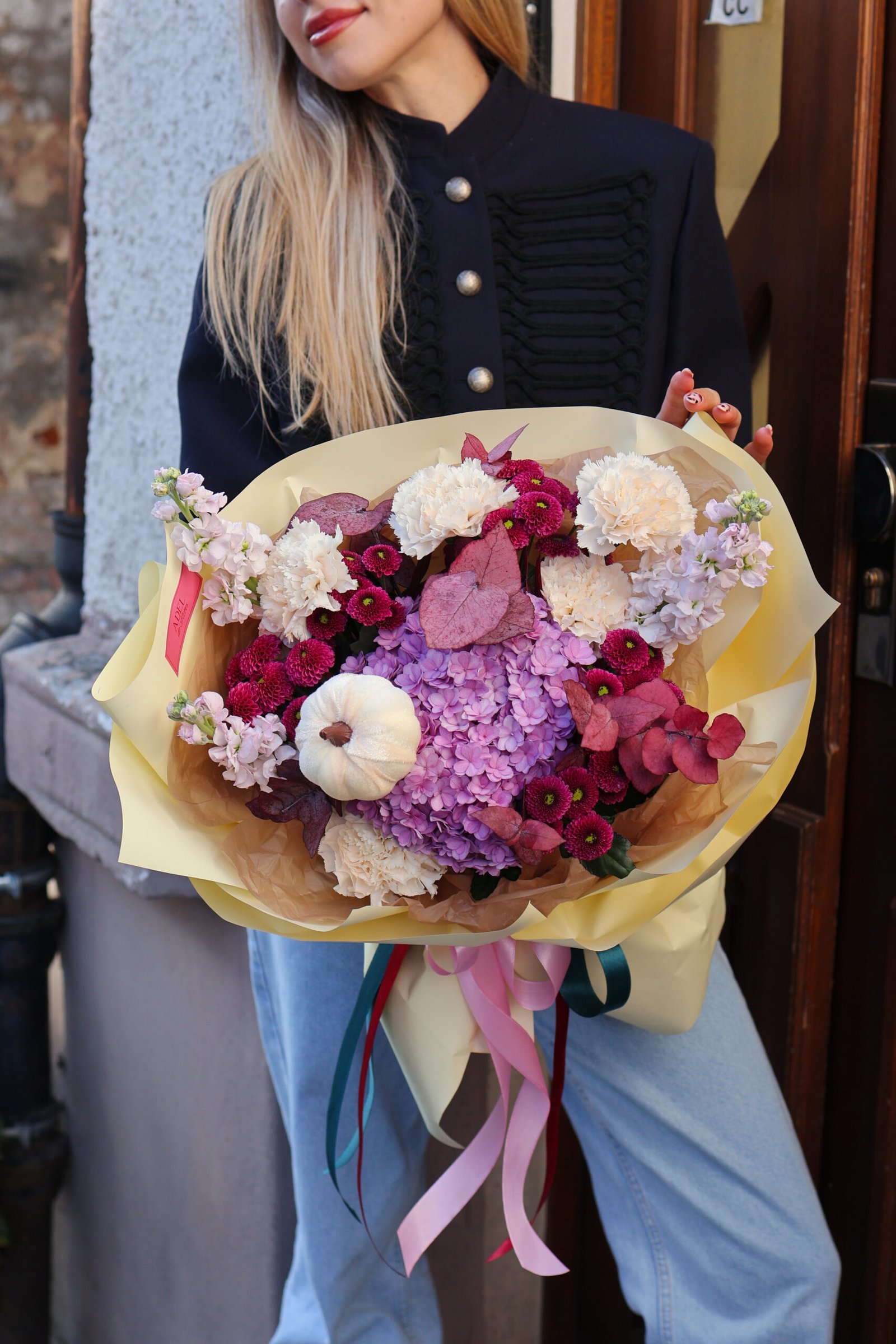 Ciepła i elegancka kompozycja inspirowana kolorami jesieni. Delikatne beżowe goździki nadają lekkości, fioletowa hortensja wprowadza głębię i nutę tajemniczości, a bordowy eukaliptus dodaje wyrafinowania i podkreśla charakter bukietu. To idealny wybór na prezent lub stylową dekorację wnętrza – pełen harmonii i jesiennego uroku.