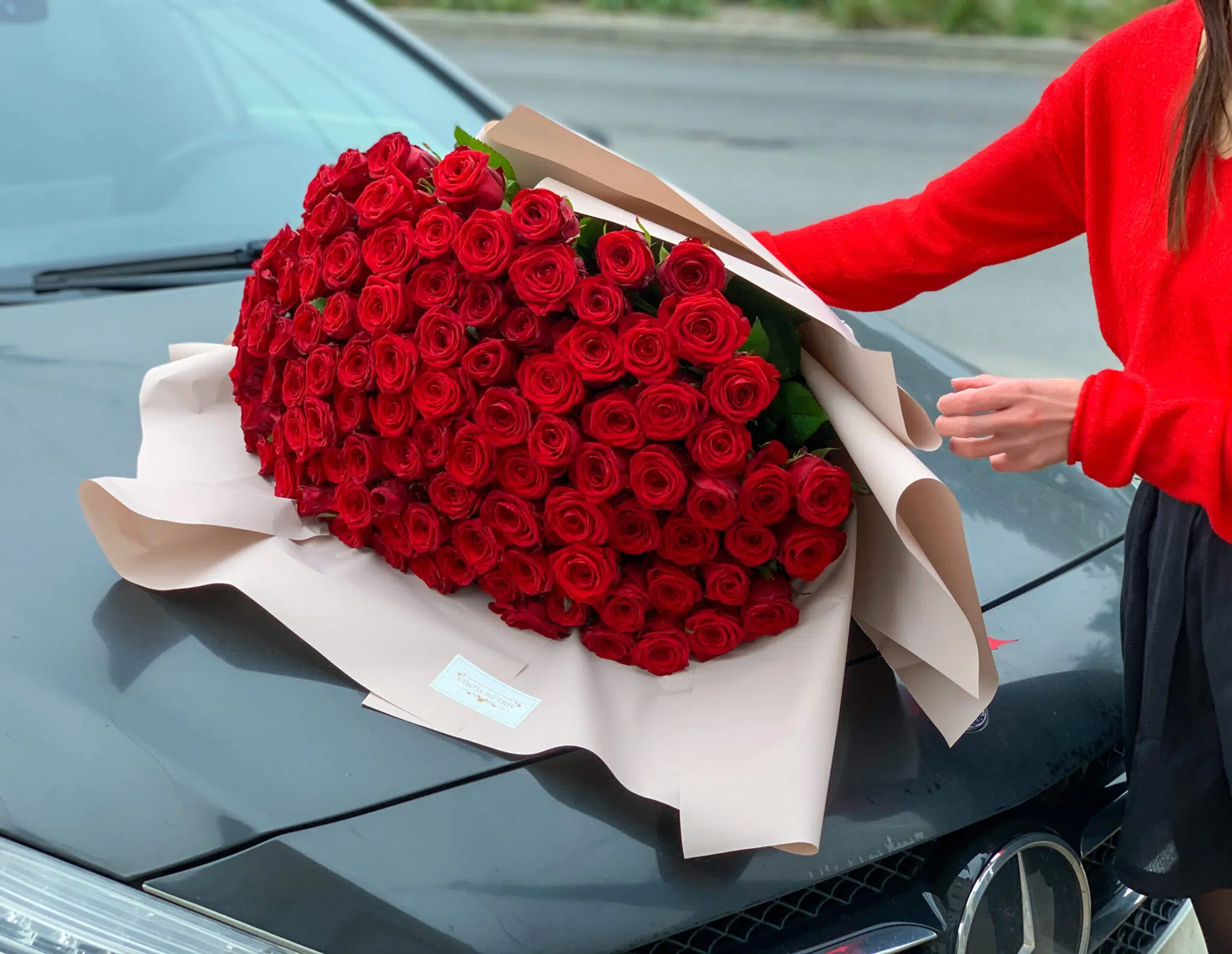 Bukiet ze 101 róży odmiany Red Naomi w eleganckim wodoodpornym opakowaniu.