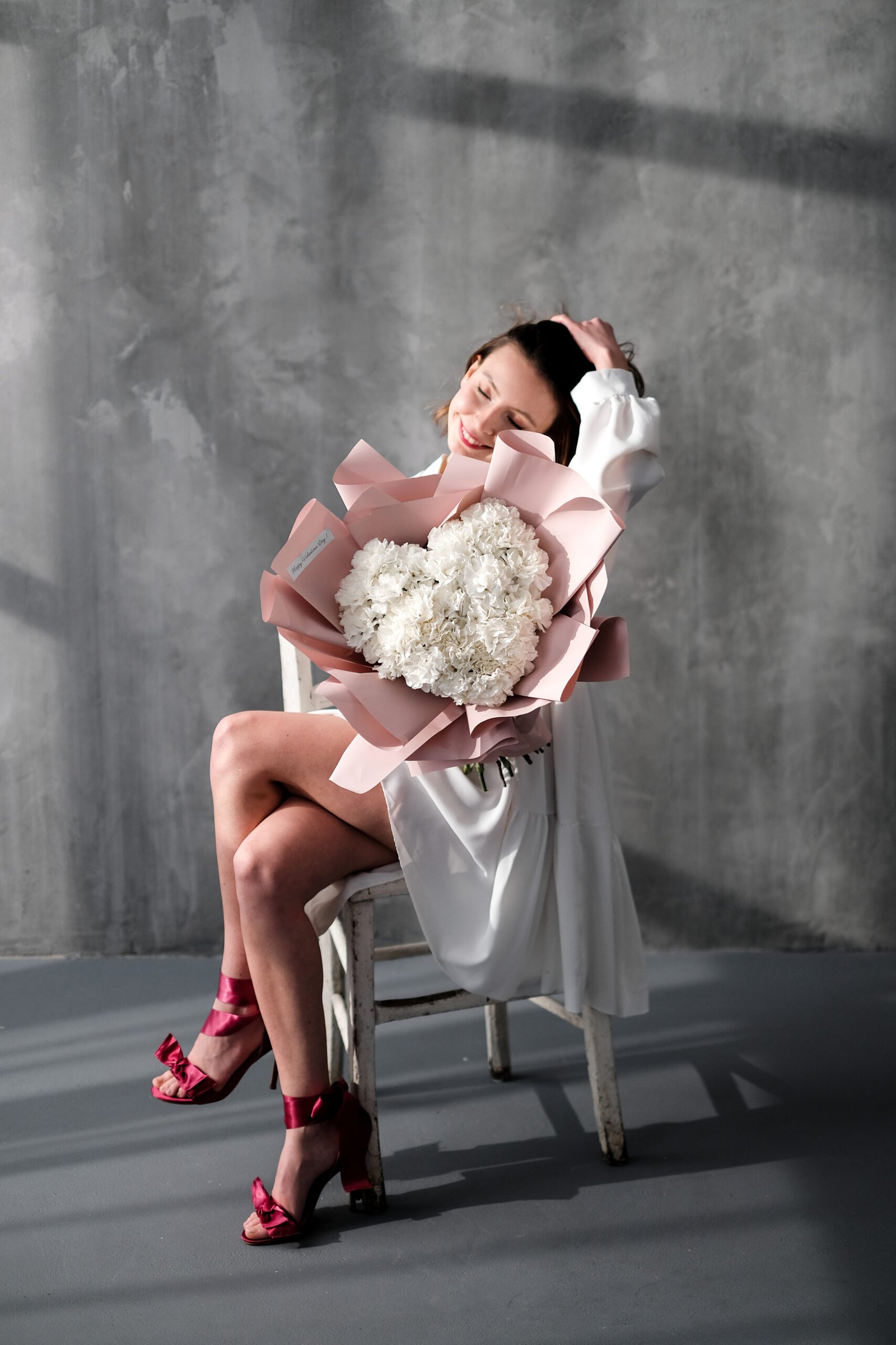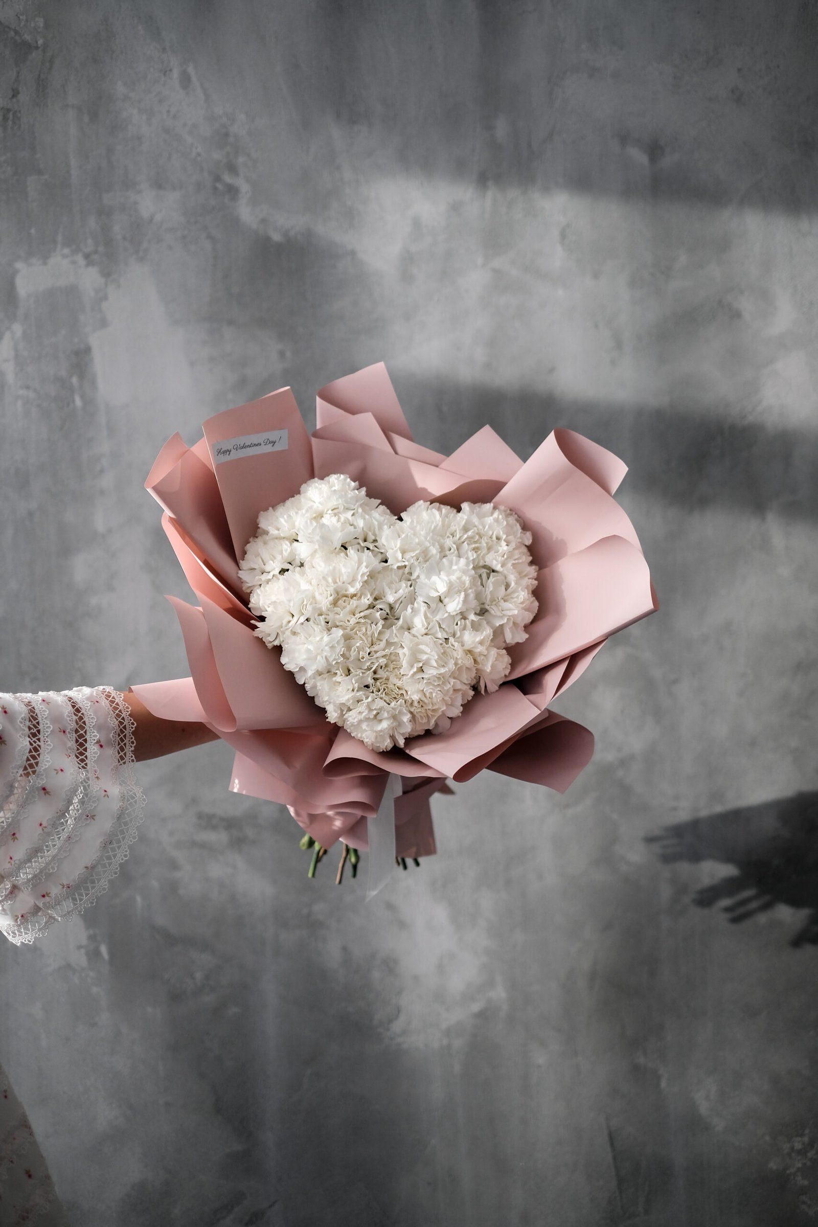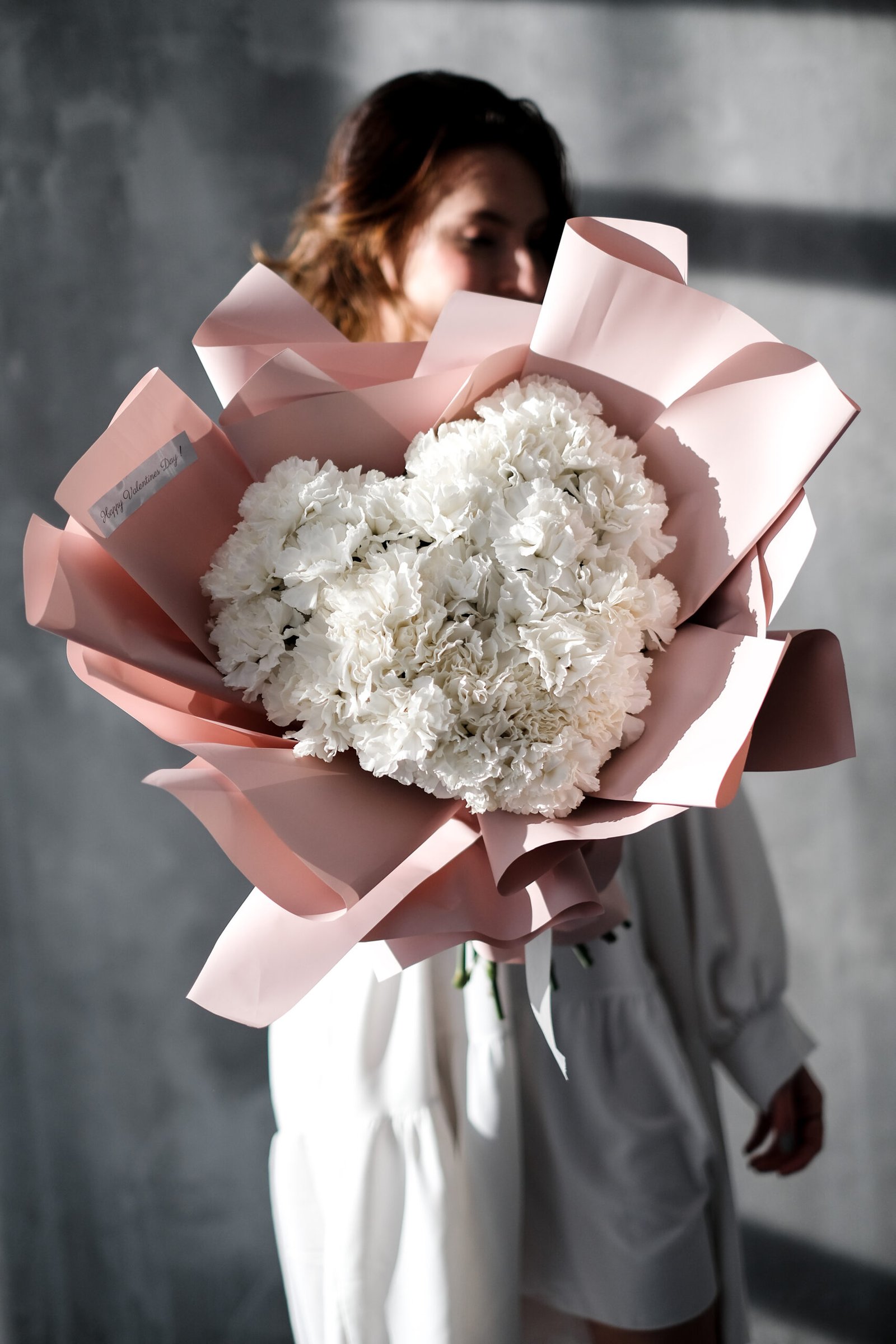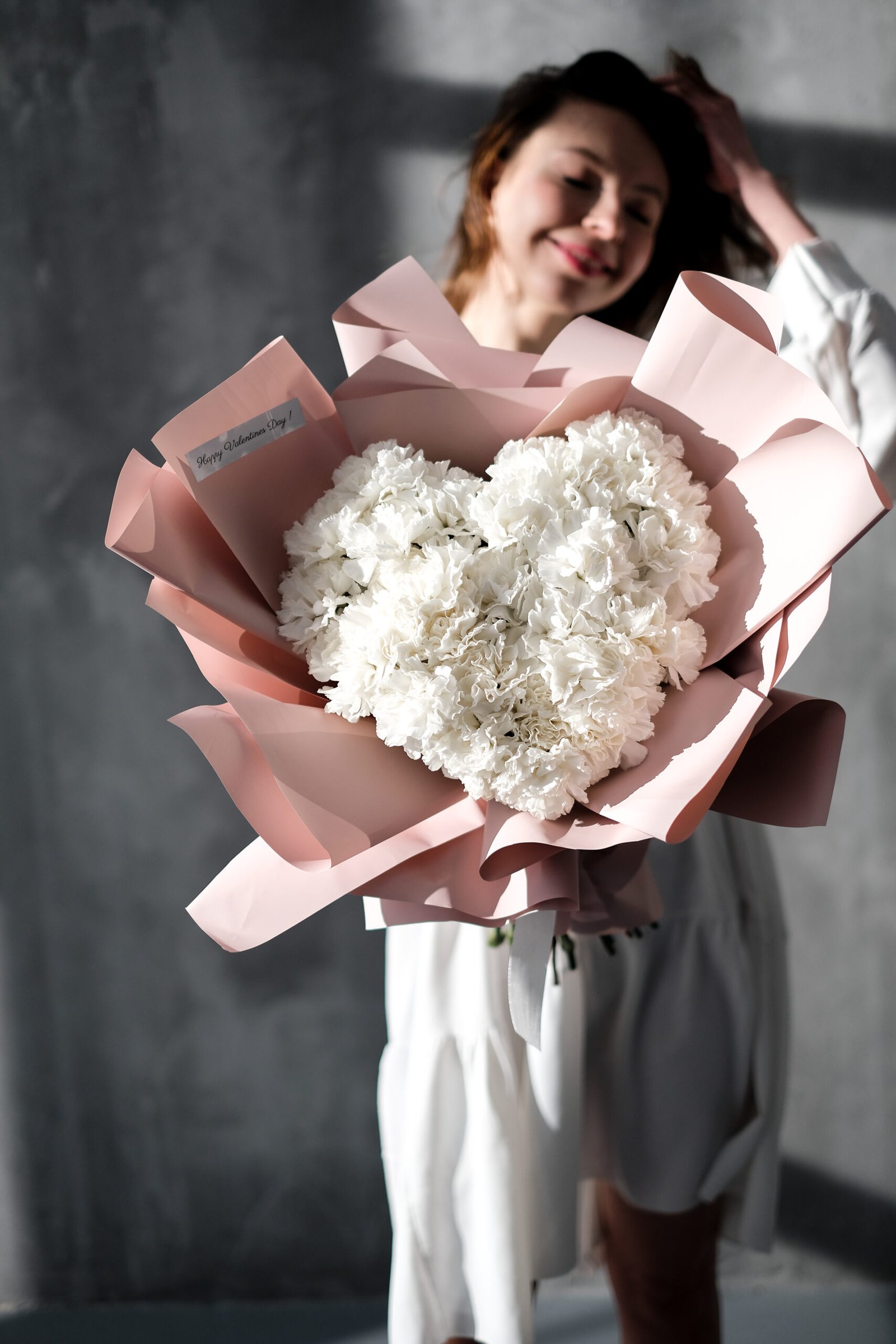 Romantyczny bukiet ułożony w kształcie serca z delikatnych białych goździków, symbolizujących czystość, szczerość i ponadczasową elegancję. Kompozycja przyciąga uwagę swoją formą i subtelną kolorystyką, idealnie sprawdzając się jako prezent na Walentynki, rocznicę, ślub lub wyjątkowe wyznanie uczuć. Całość dopełnia nowoczesne, eleganckie opakowanie, które może się różnić w zależności od dostępności, zawsze zachowując spójny i stylowy charakter.