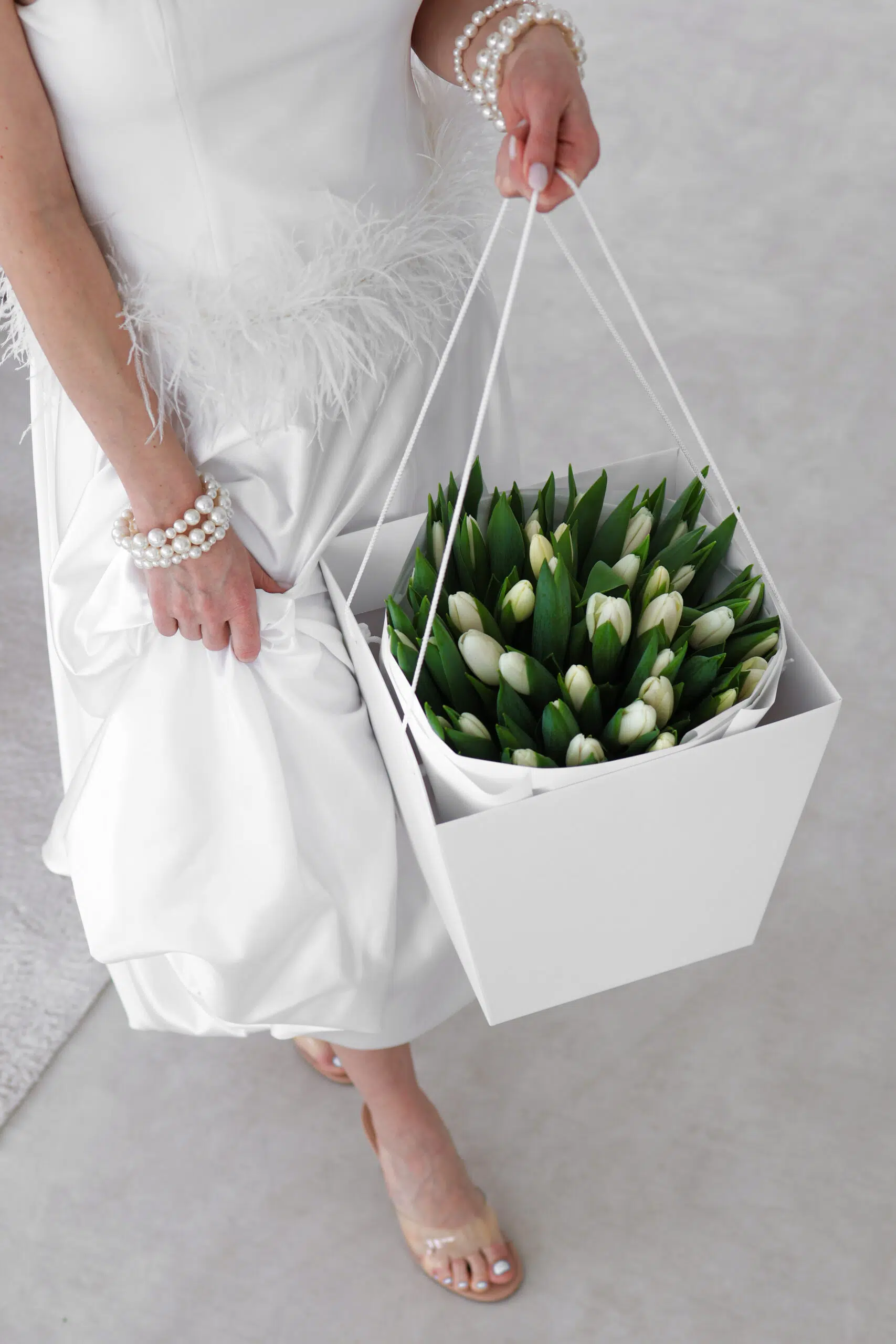 Śnieżnobiałe tulipany o subtelnie zaokrąglonych płatkach tworzą harmonijną, pełną gracji kompozycję. Ich czysta forma i delikatna kolorystyka niosą ze sobą przesłanie niewinności, spokoju i ponadczasowego piękna. To bukiet, który idealnie podkreśli wyjątkowe chwile — pełne uczuć, czułości i szczerości.