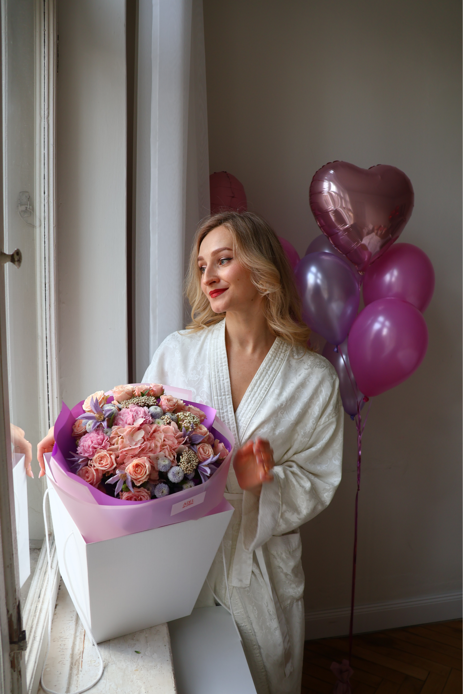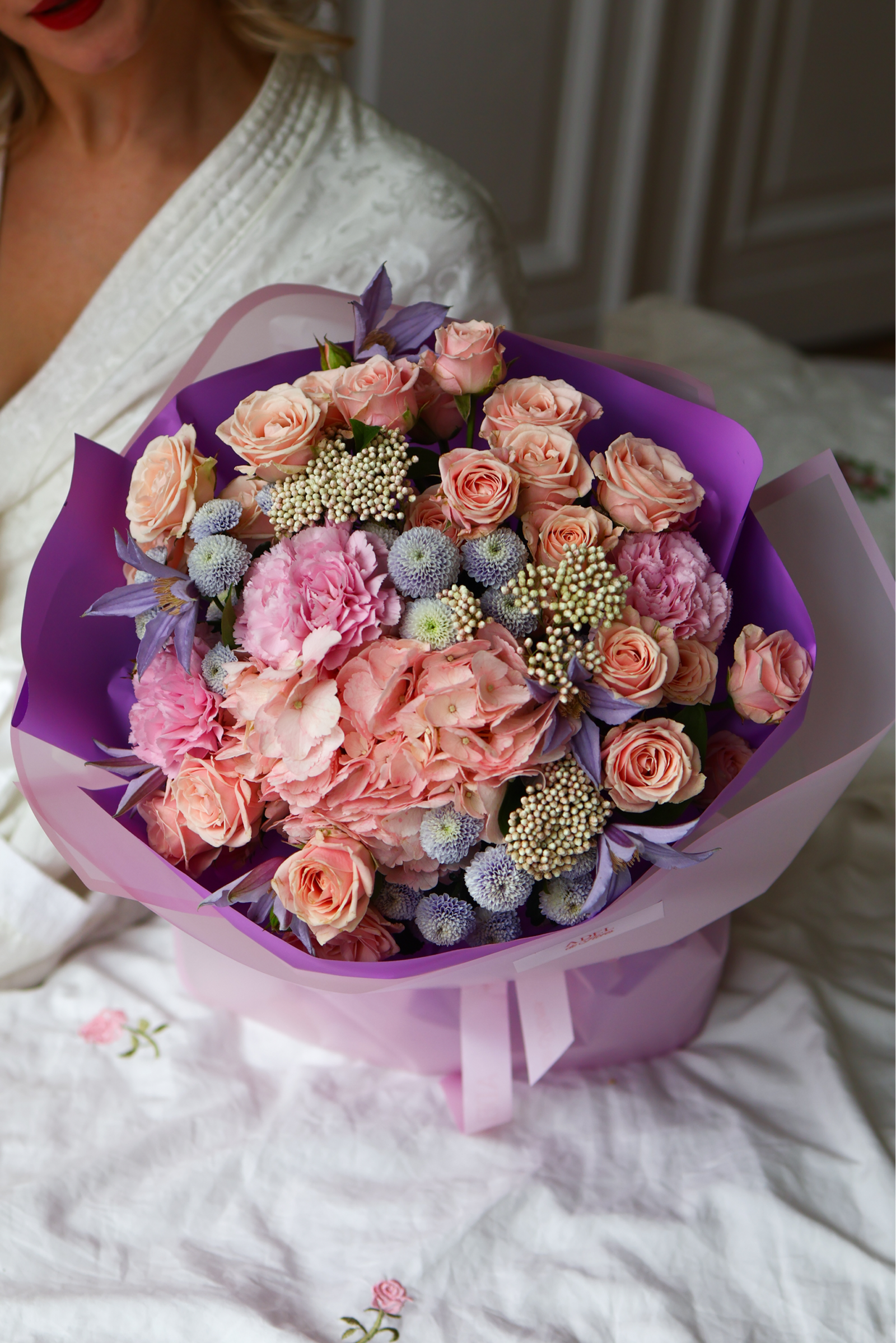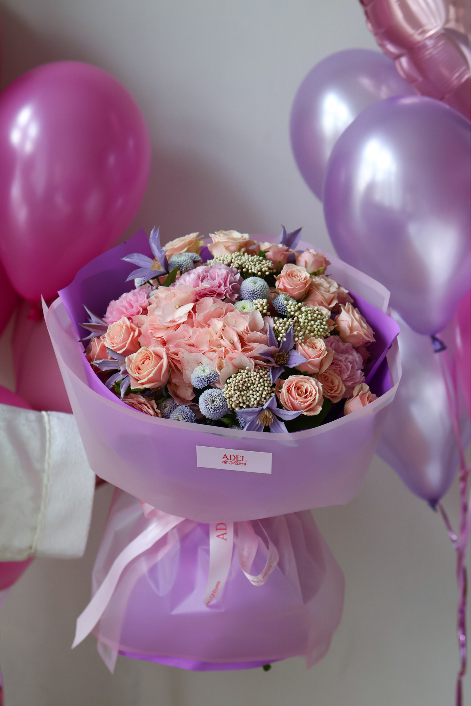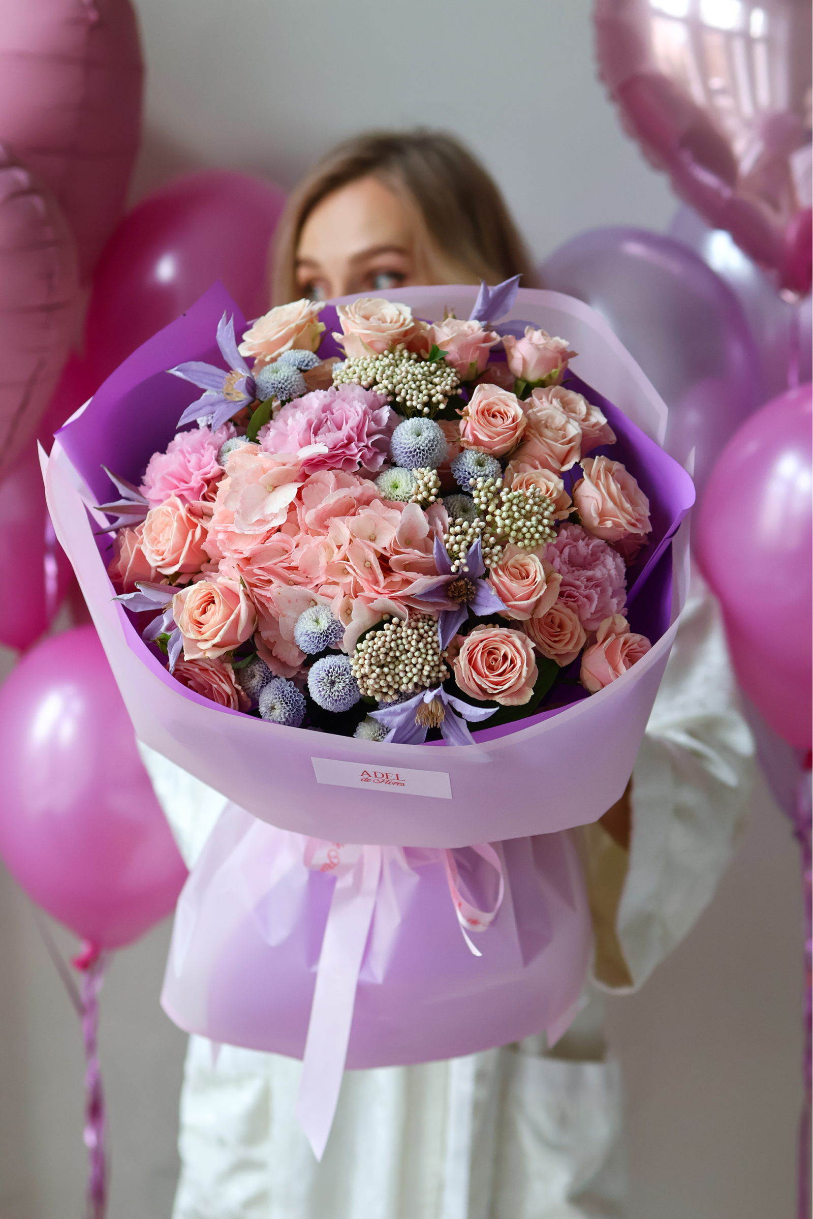 Delikatna i harmonijna kompozycja utrzymana w pastelowych odcieniach brzoskwini, pudrowego różu i subtelnego fioletu. Brzoskwiniowe róże nadają bukietowi ciepła i romantycznego charakteru, hortensja buduje miękką, pełną formę, a klematisy oraz drobne dekoracyjne akcenty wprowadzają lekkość i nowoczesną elegancję. Całość prezentuje się bardzo subtelnie i świeżo, idealnie sprawdzając się jako prezent na urodziny, baby shower, rocznicę lub wyjątkowy, czuły gest.