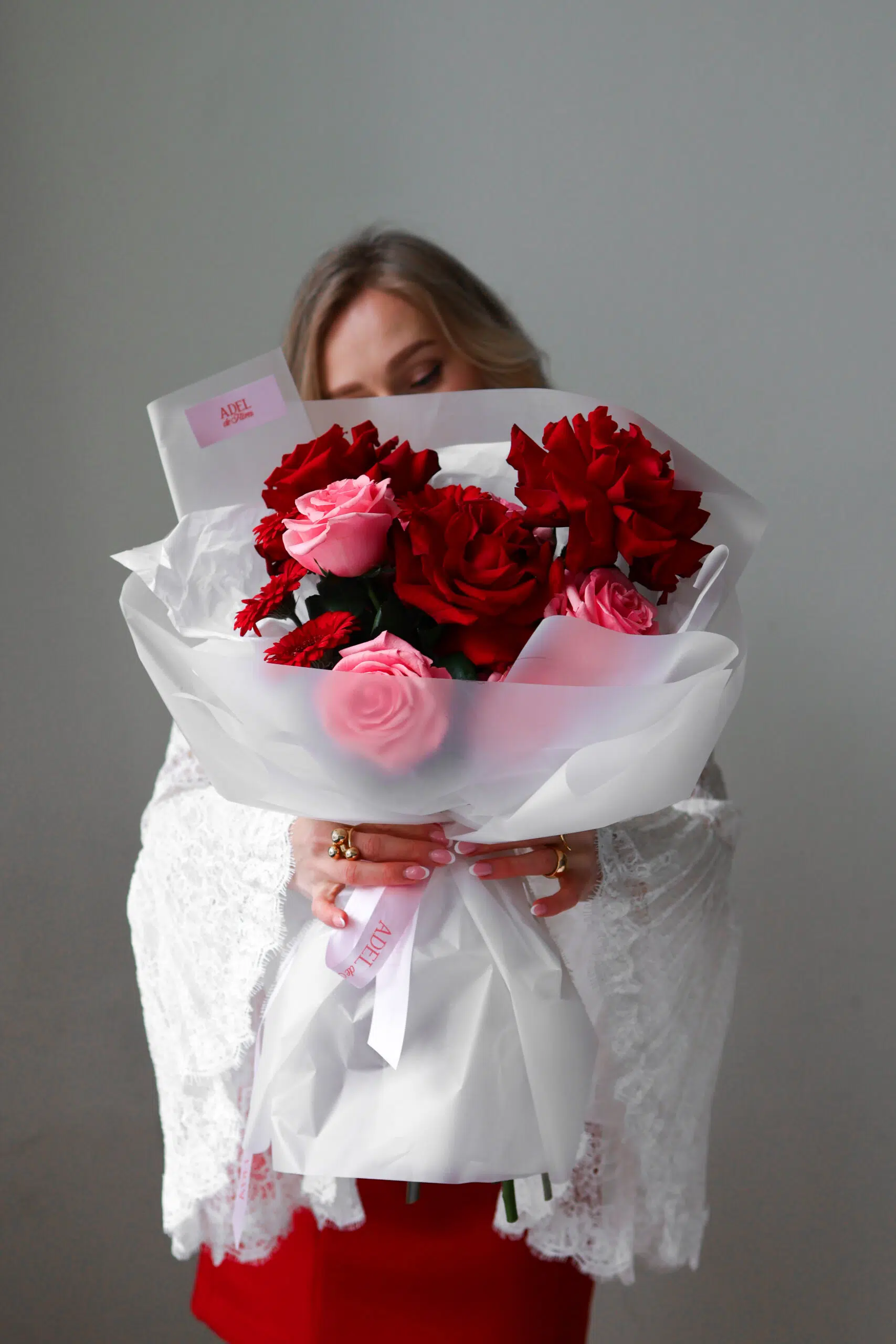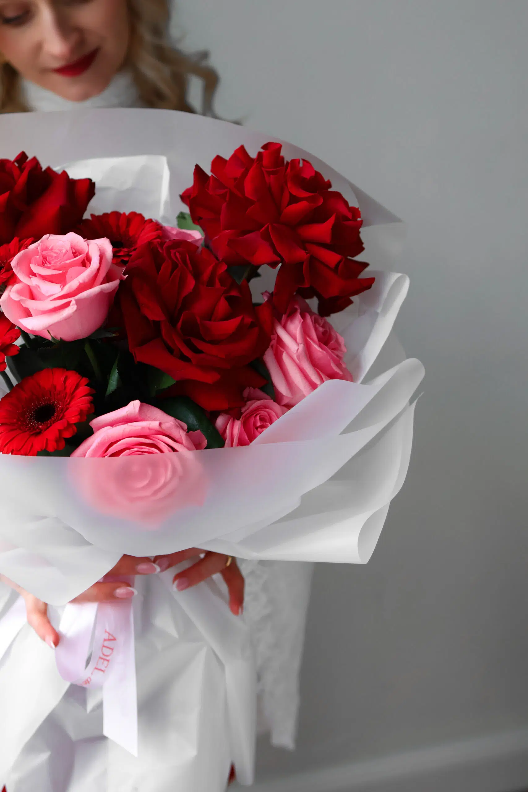 Wyrazisty i elegancki bukiet łączący klasyczną czerwień z delikatnym różem. Intensywnie czerwone róże nadają kompozycji głębi i wyrazistości, różowe róże wprowadzają subtelność i lekkość, a czerwone gerbery dodają nowoczesnego akcentu oraz świeżości. Całość tworzy harmonijną, pełną formę, która przyciąga uwagę i doskonale sprawdzi się jako prezent na urodziny, rocznicę, Walentynki lub ważny gest bez okazji.