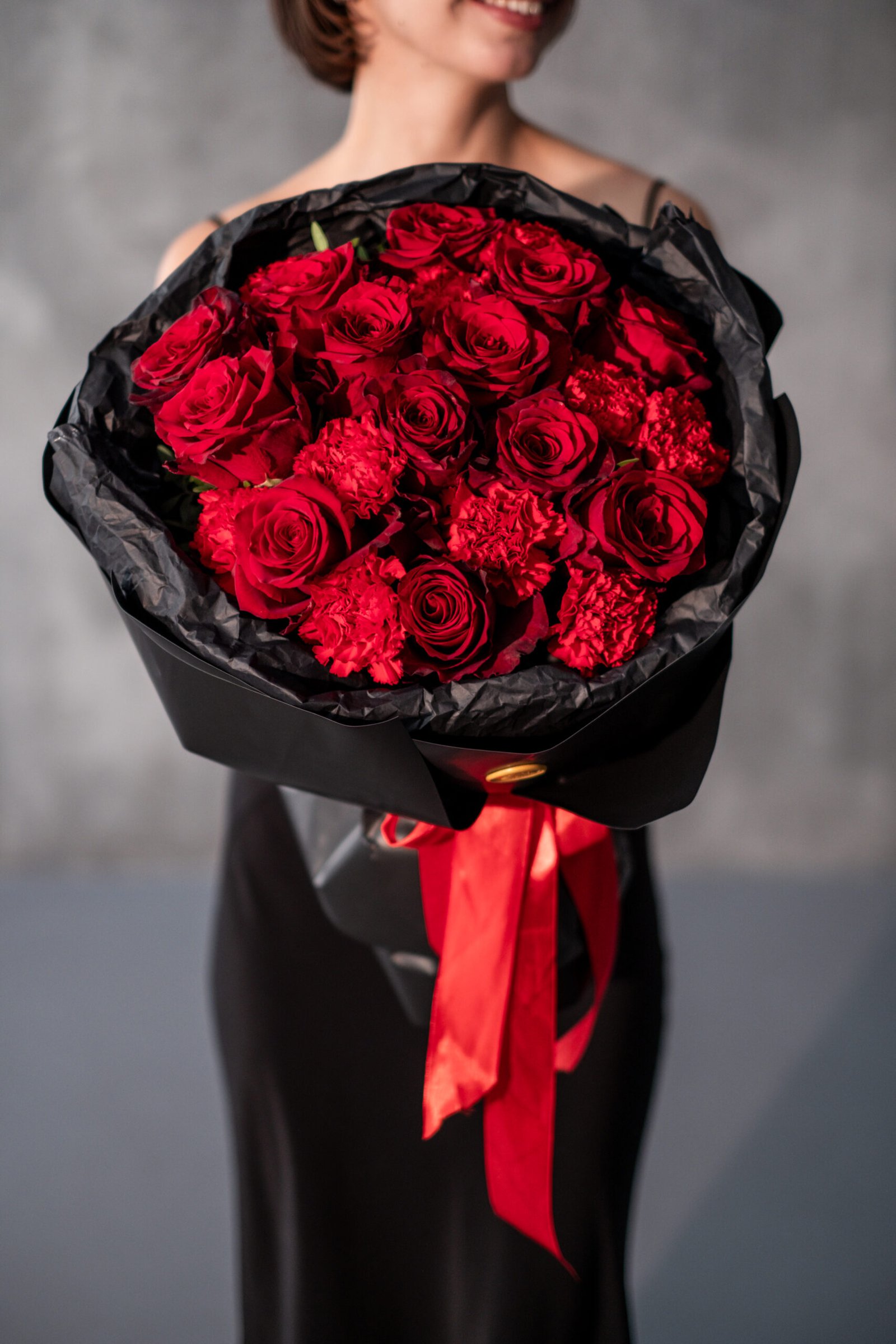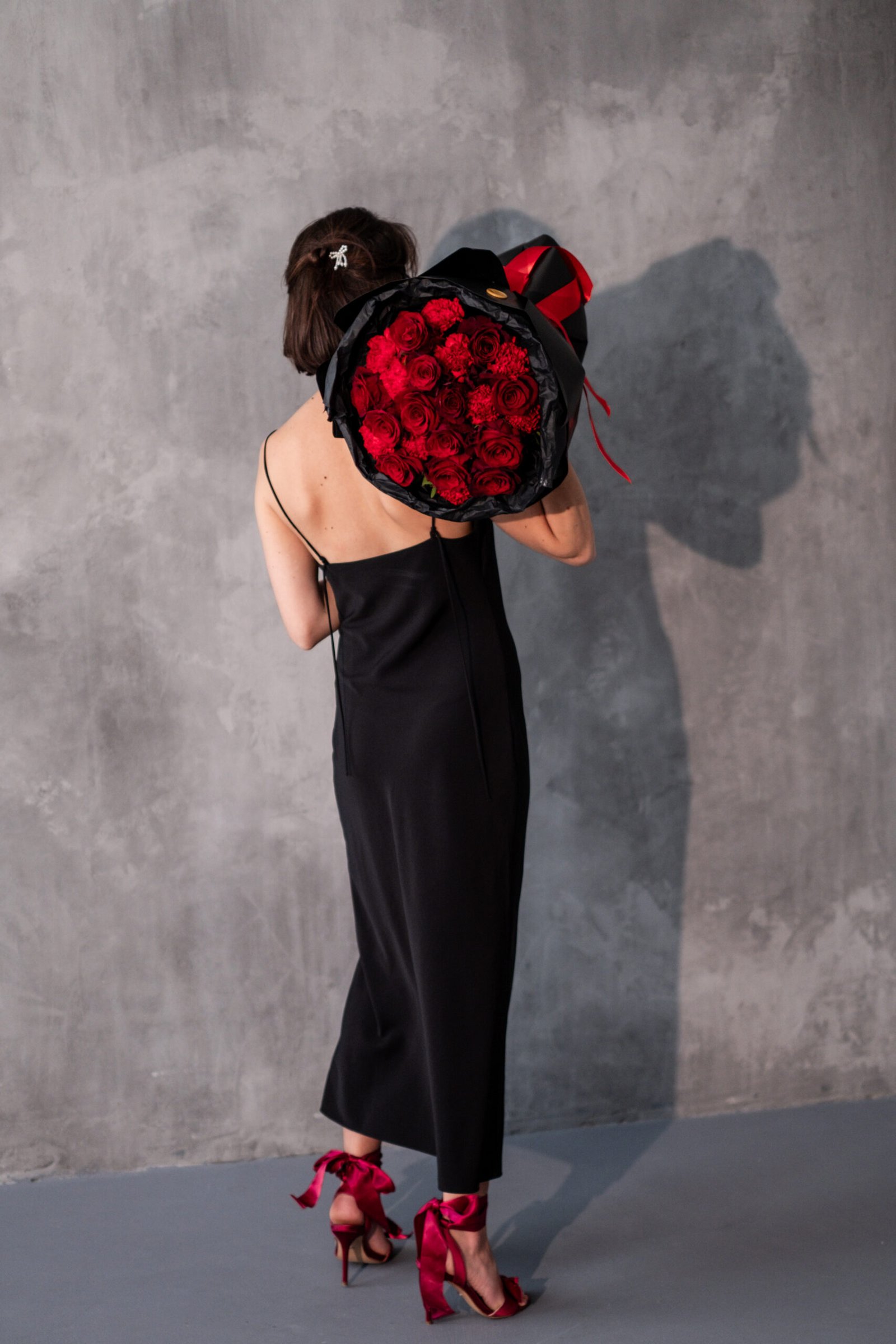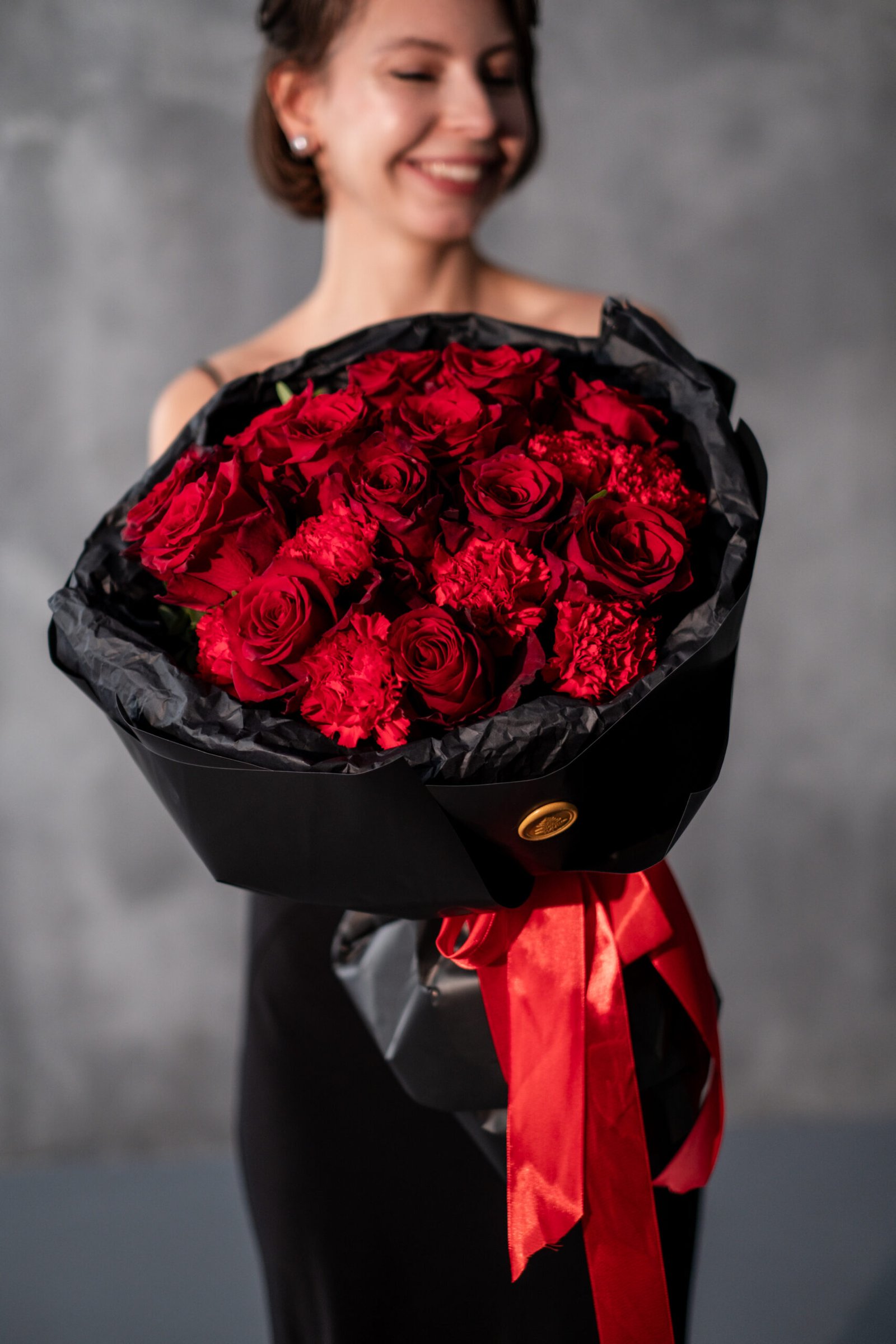 Wyrazista, wieczorowa kompozycja utrzymana w głębokich odcieniach czerwieni, łącząca klasyczne róże z fakturalnymi goździkami. Kontrast aksamitnych płatków i bogatej struktury kwiatów nadaje bukietowi mocny, luksusowy charakter. To propozycja dla osób, które szukają efektownego prezentu z pazurem – idealna na Walentynki, rocznicę lub wyjątkowe wyznanie uczuć. Ciemne, nowoczesne opakowanie podkreśla intensywność kolorów i elegancję całej formy. Opakowanie może się różnić w zależności od dostępności, zawsze zachowując spójny, butikowy styl.