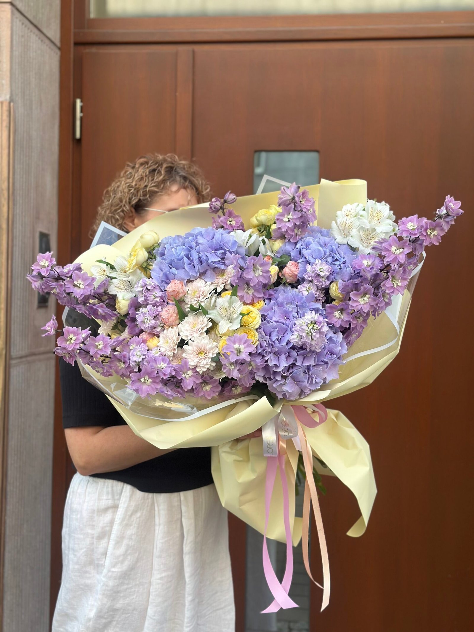 Delikatna i pełna romantyzmu kompozycja, w której puszyste hortensje łączą się z subtelną różą krzaczastą, tworząc elegancką podstawę bukietu. Lawendowa lewkonia wprowadza lekkość i aromatyczny akcent, a fioletowe delfinium dodaje finezji i smukłej elegancji. To bukiet idealny na wyjątkowe chwile, kiedy liczy się harmonia kolorów, świeżość i subtelne piękno.