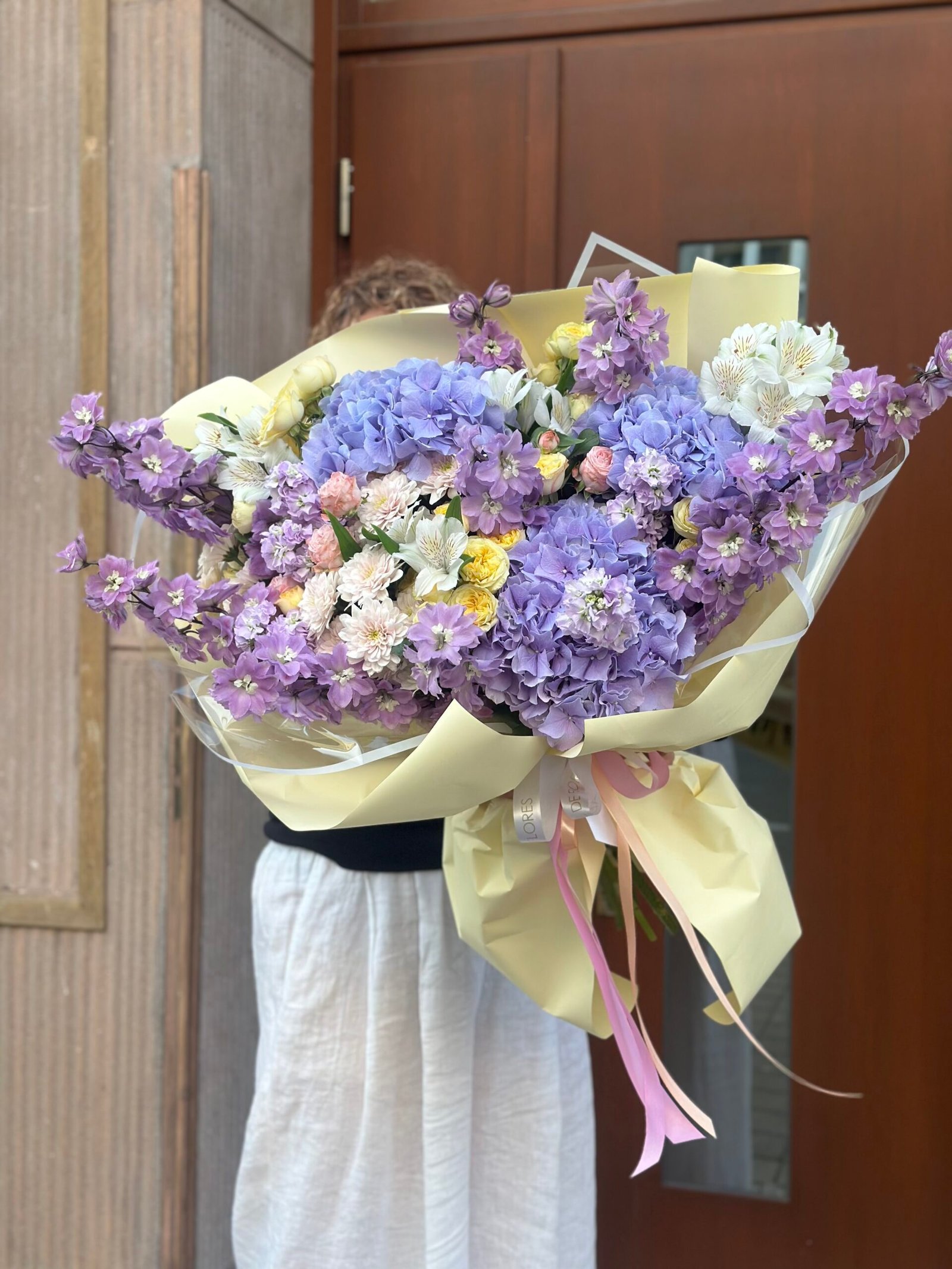 Bukiet z fioletowych hortensji, róży, lewkonii i delfinium