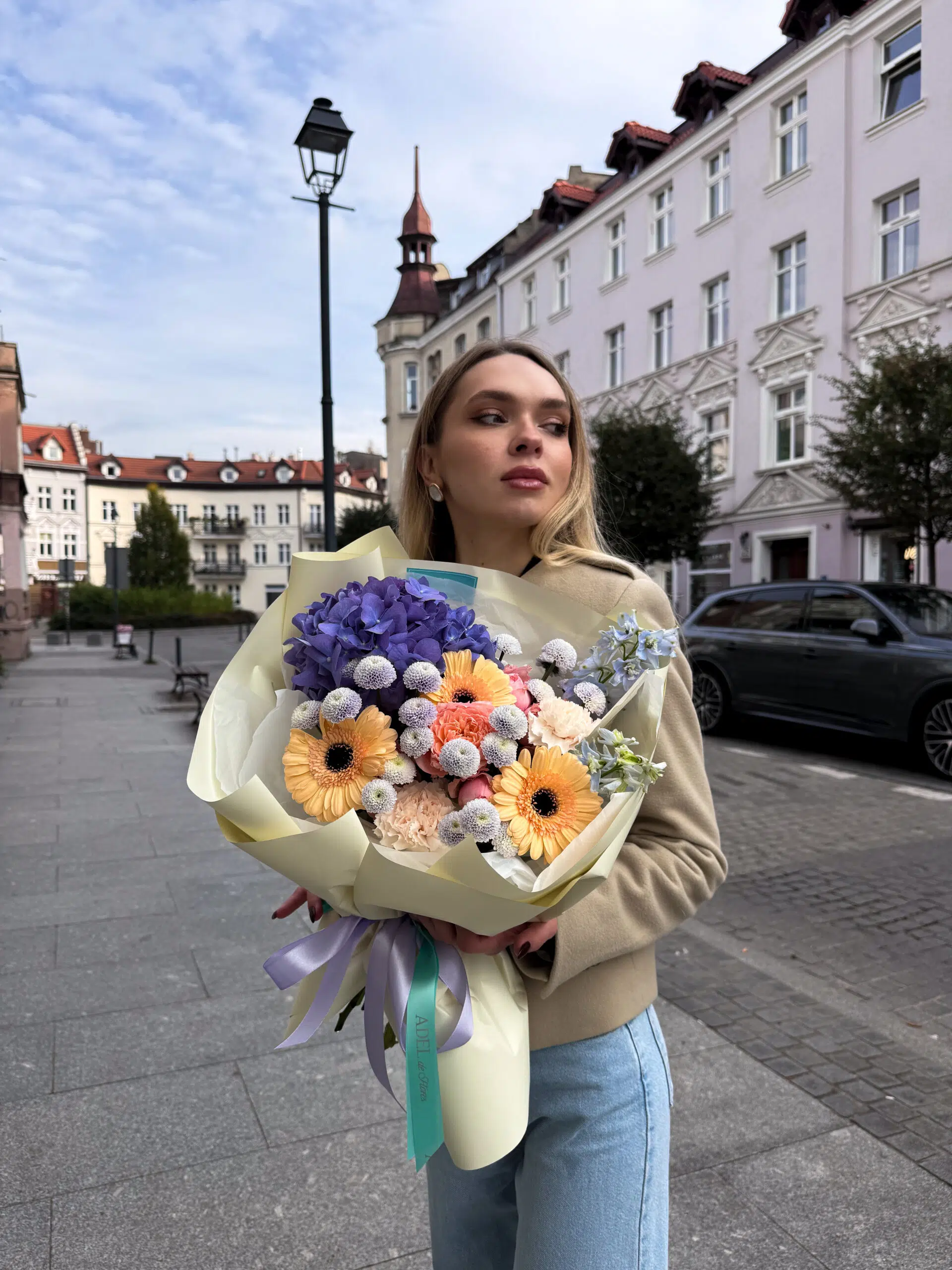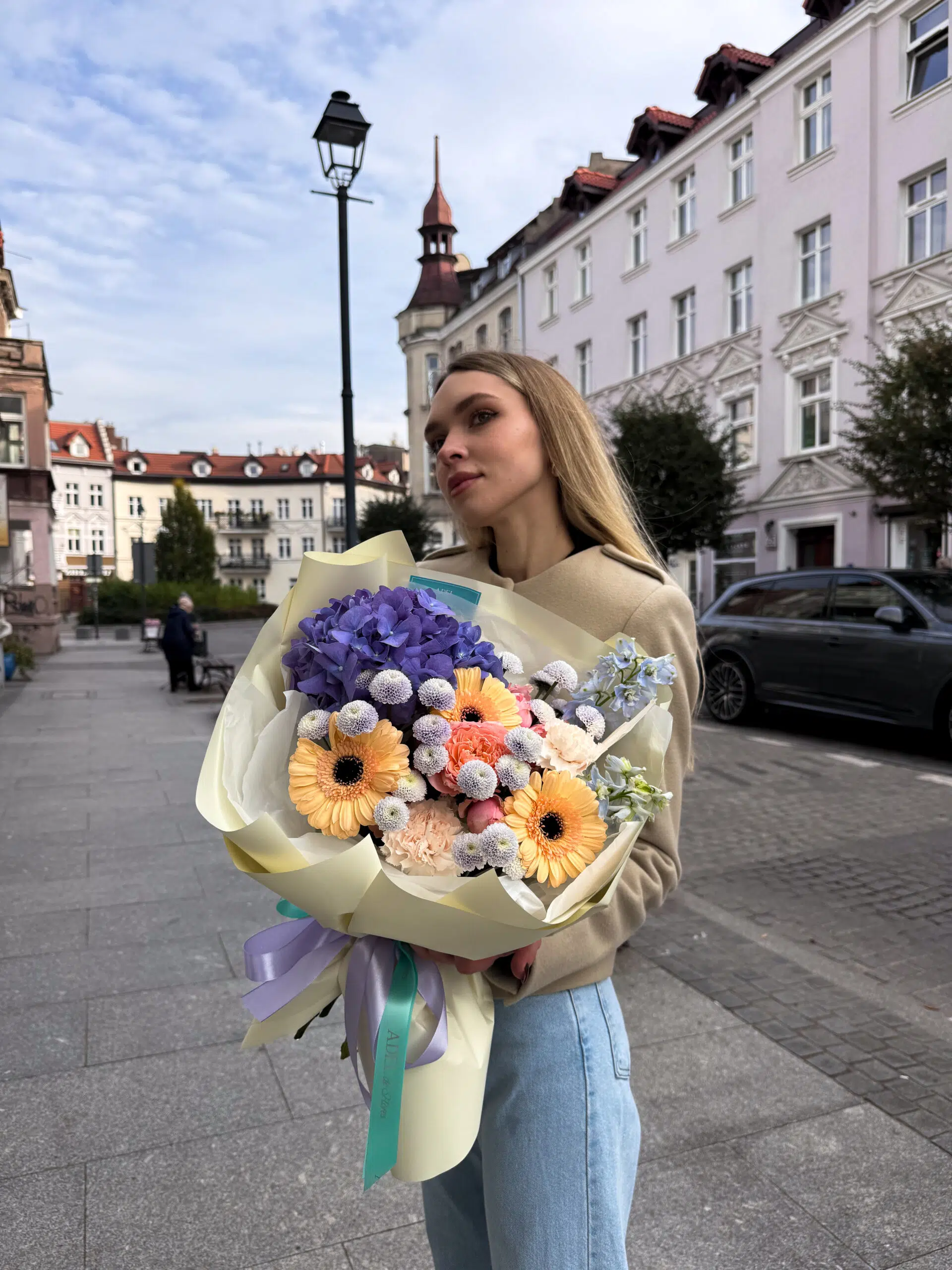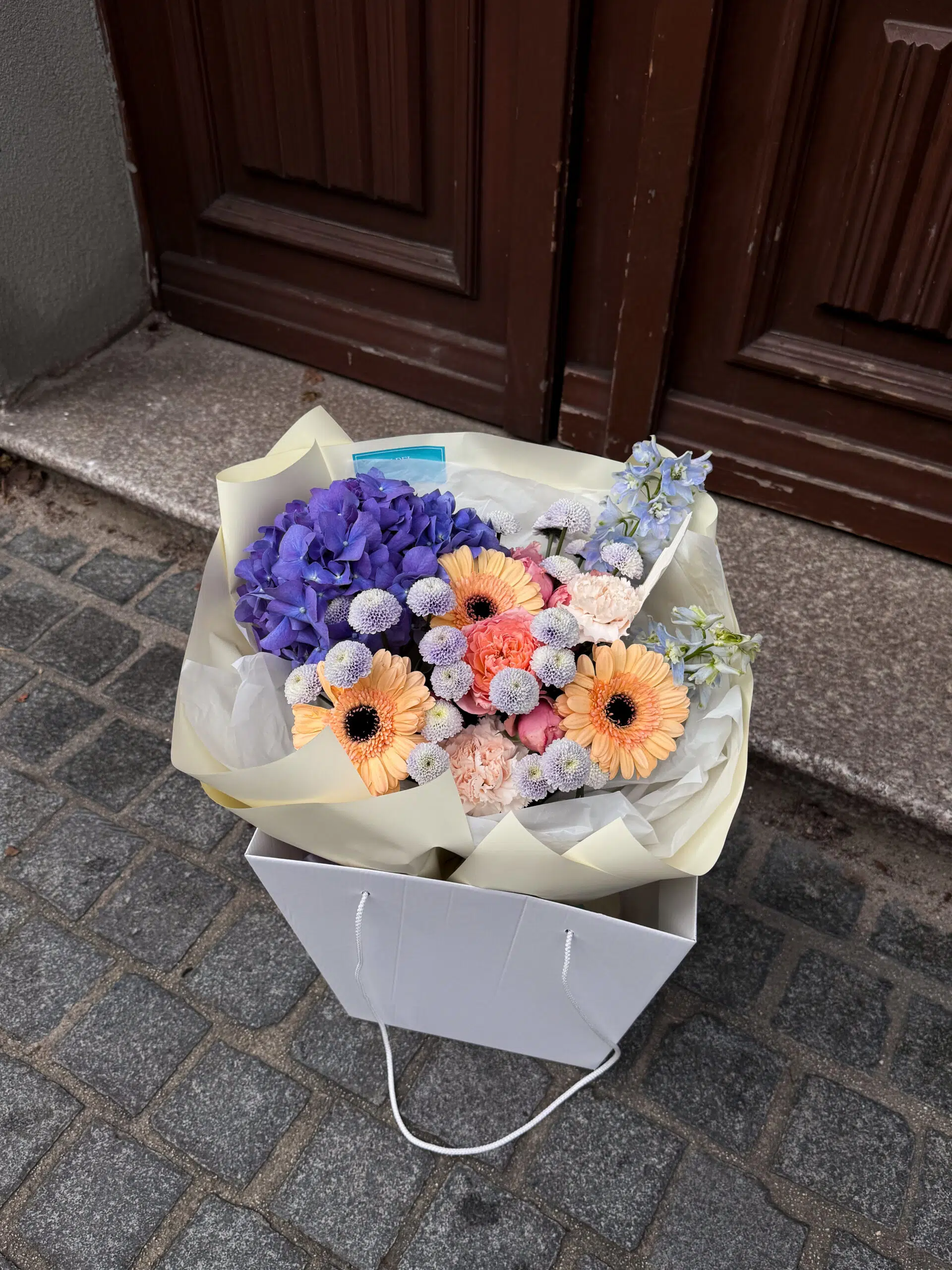 Świeży i pełen harmonii bukiet w chłodnych i pastelowych tonach. Niebieska hortensja stanowi efektowny, miękki akcent, który pięknie łączy się z delikatnymi, brzoskwiniowymi gerberami. Fioletowe santini dodają głębi i kontrastu, a błękitny delfinium wprowadza lekkość i elegancję. To wyjątkowa kompozycja, która zachwyca subtelną kolorystyką i idealnie sprawdzi się jako prezent na każdą okazję.