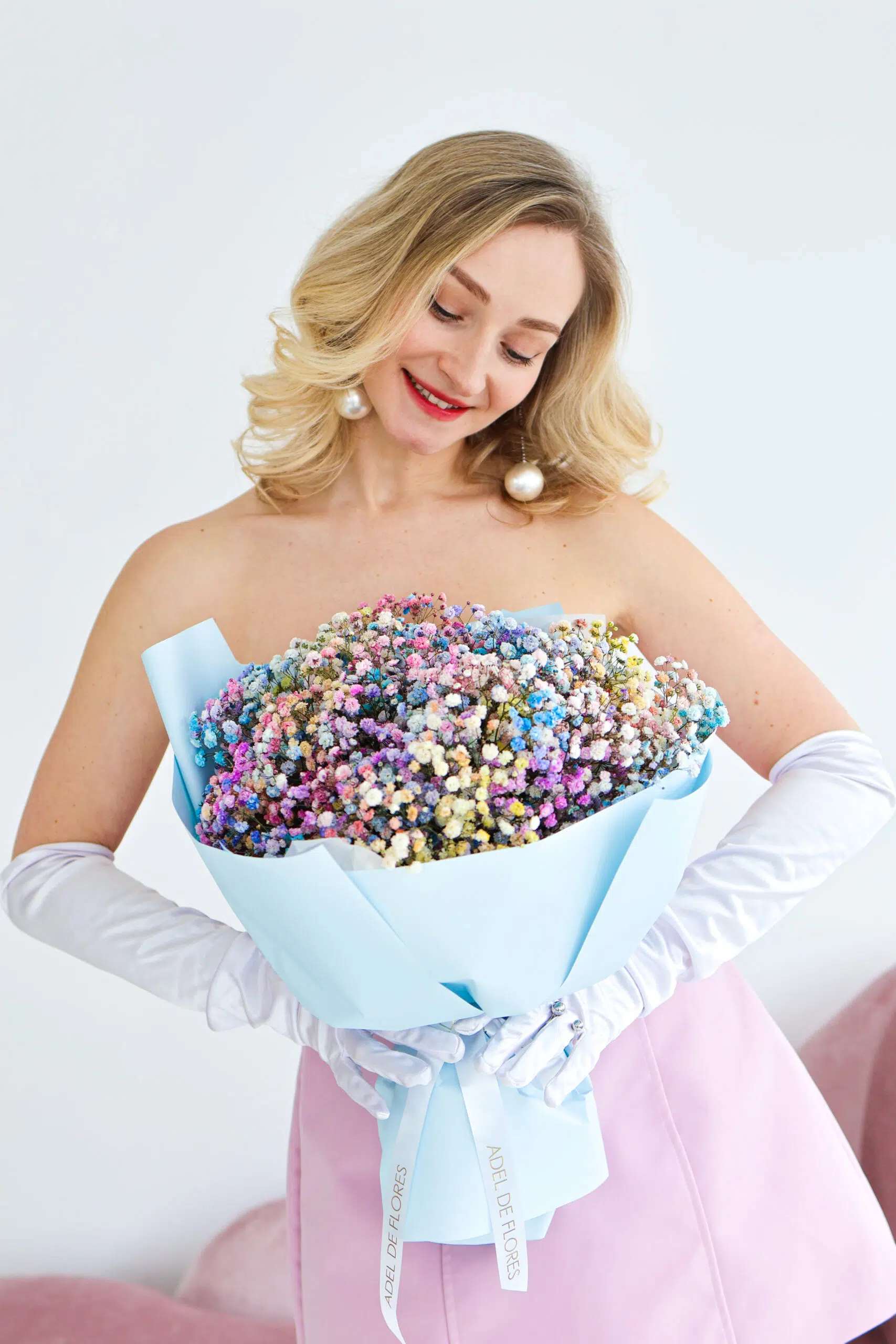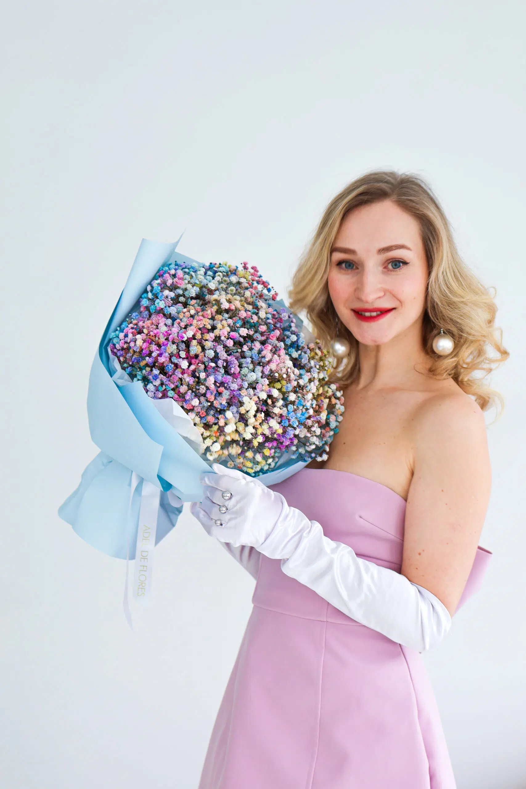 Kolorowa gipsówka, niczym mgiełka drobnych kwiatów w odcieniach różu, błękitu, fioletu i żółci, tworzy bajkowy, eteryczny bukiet. To kwiatowa opowieść o radości, beztrosce i marzeniach, idealna na wyjątkowe okazje i magiczne momenty.