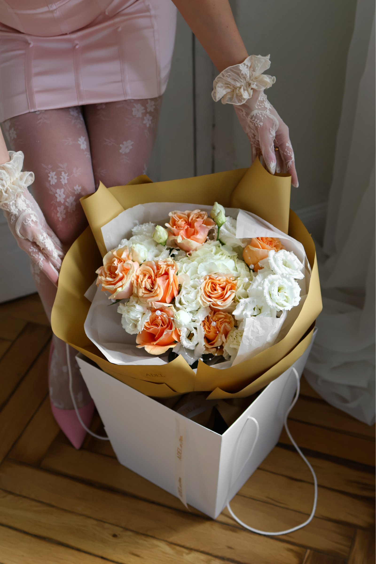 Każdy bukiet dostarczany jest w aquaboxie, który zapewnia kwiatom odpowiednie nawodnienie, oraz w eleganckiej torbie transportowej, gwarantującej bezpieczny i estetyczny transport.