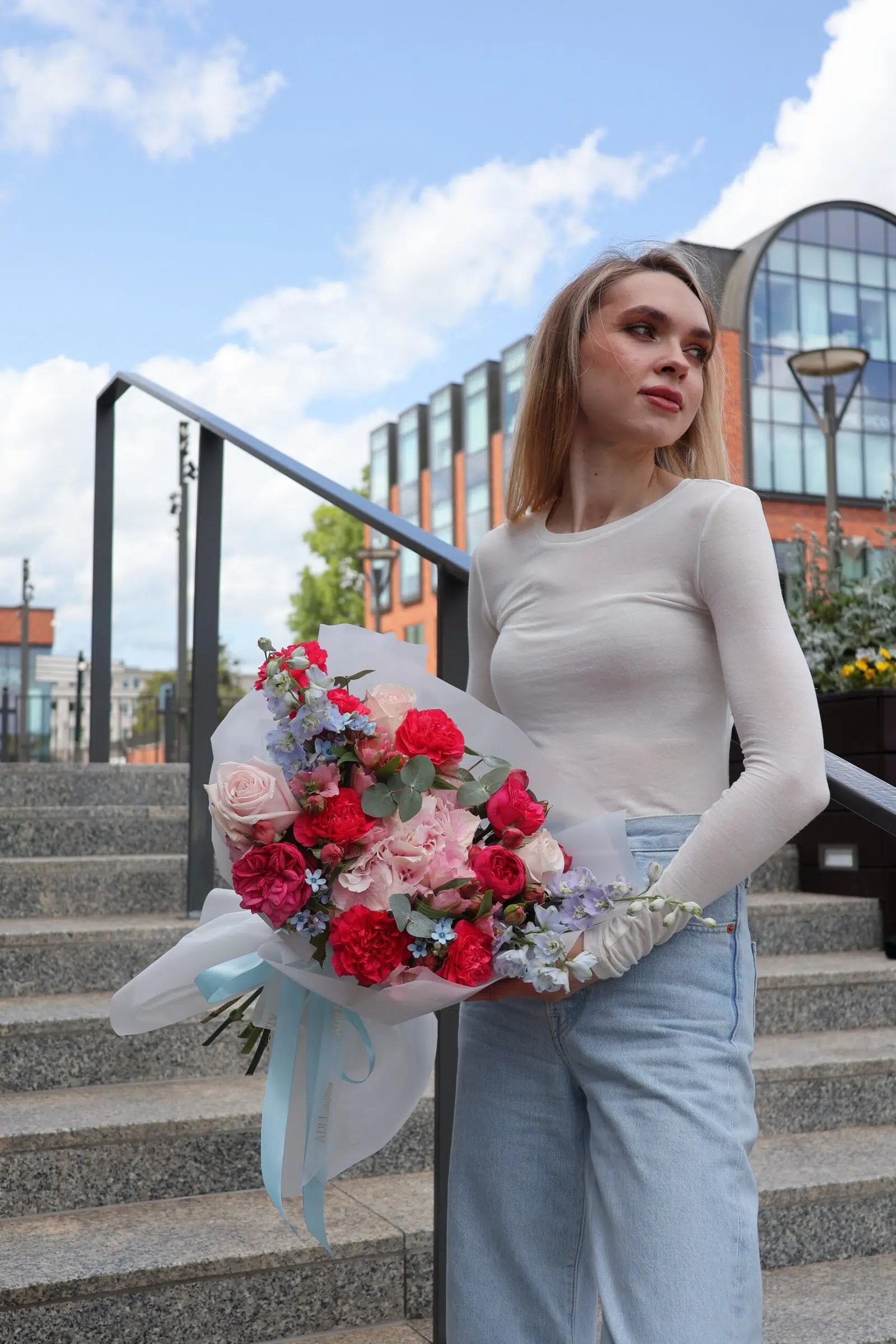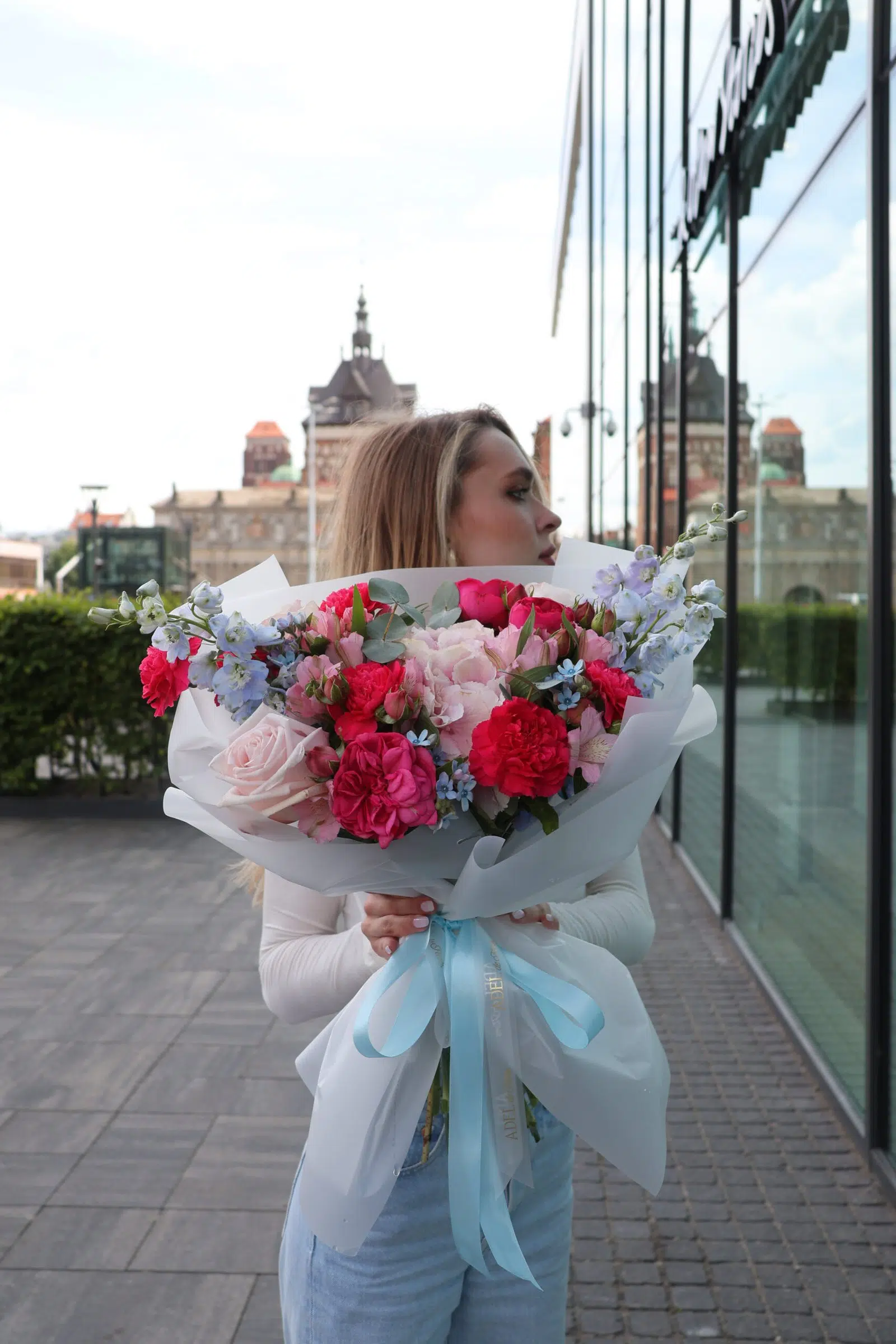 Wyrazista i pełna emocji kompozycja, w której namiętność spotyka się z delikatnością. Głębokie, czerwone róże piwoniowe nadają bukietowi dramatyczny akcent, różowa hortensja wprowadza lekkość i objętość, a smukłe delfinium dodaje elegancji i finezji. Subtelne goździki łączą całość w harmonijną i szykowną kompozycję. To bukiet stworzony na wyjątkowe chwile – gdy liczą się emocje i niezapomniane wrażenia.