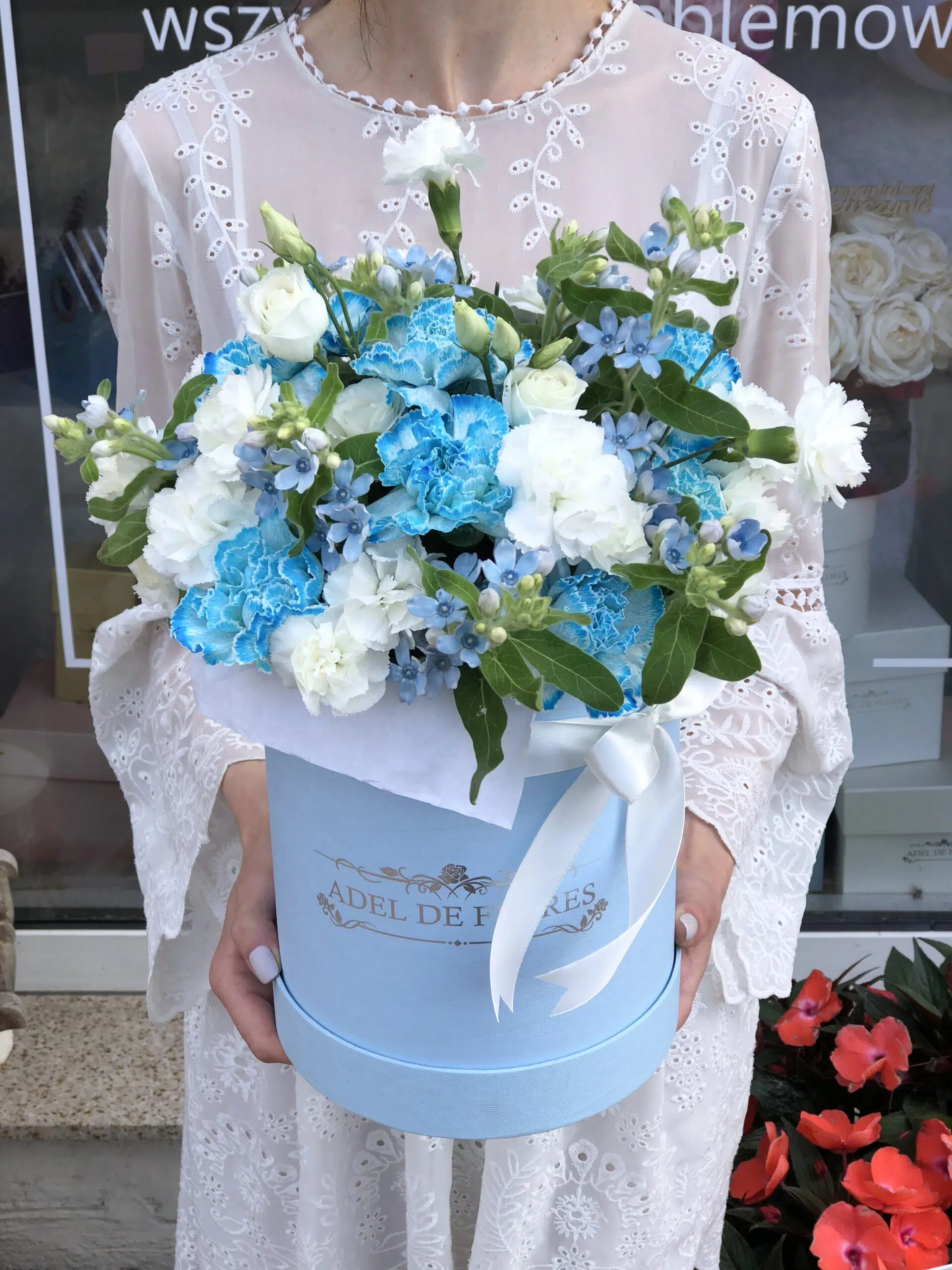 Duże pudełko z kompozycja kwiatowa w niebieskiej kolorystyce