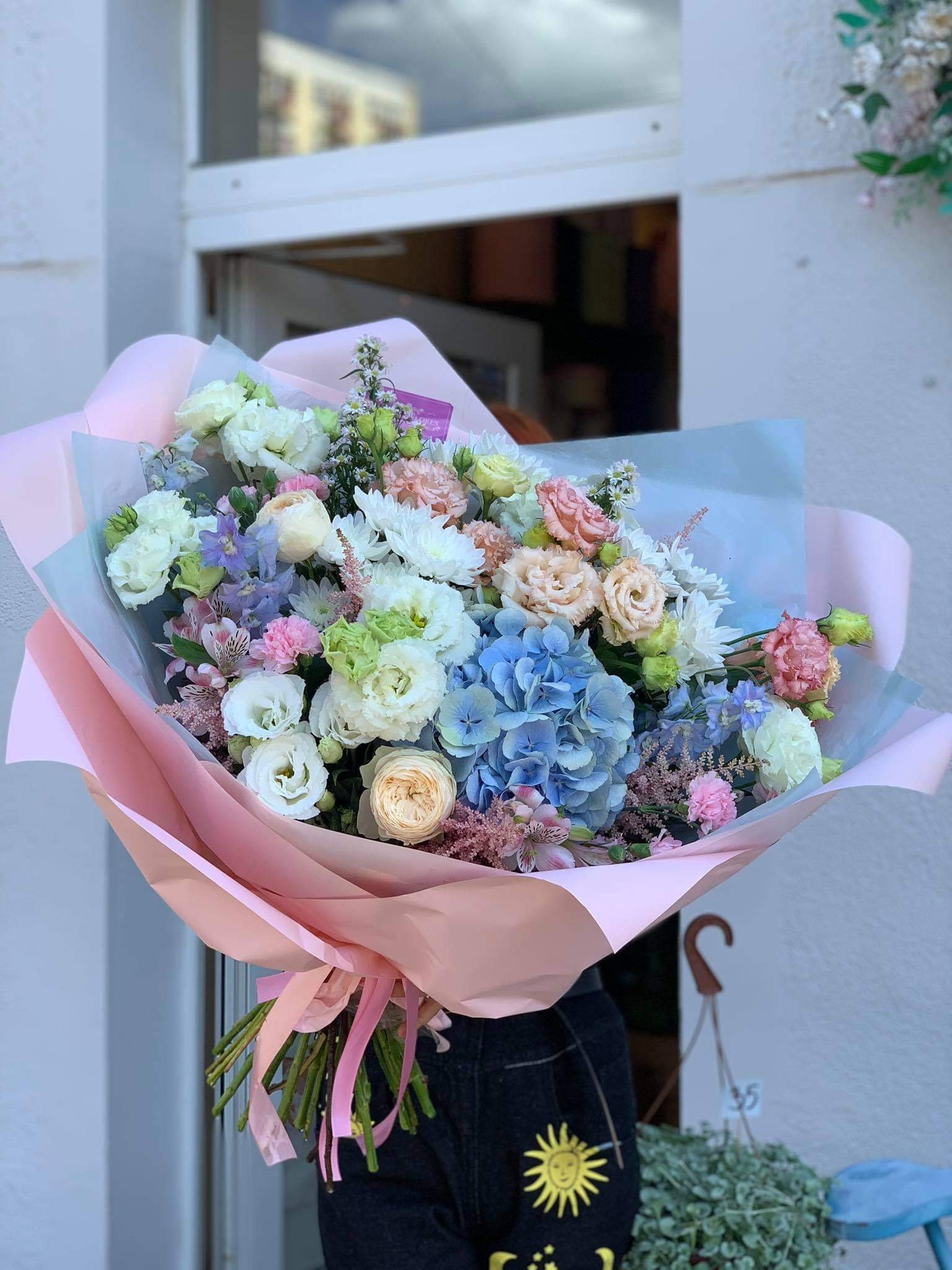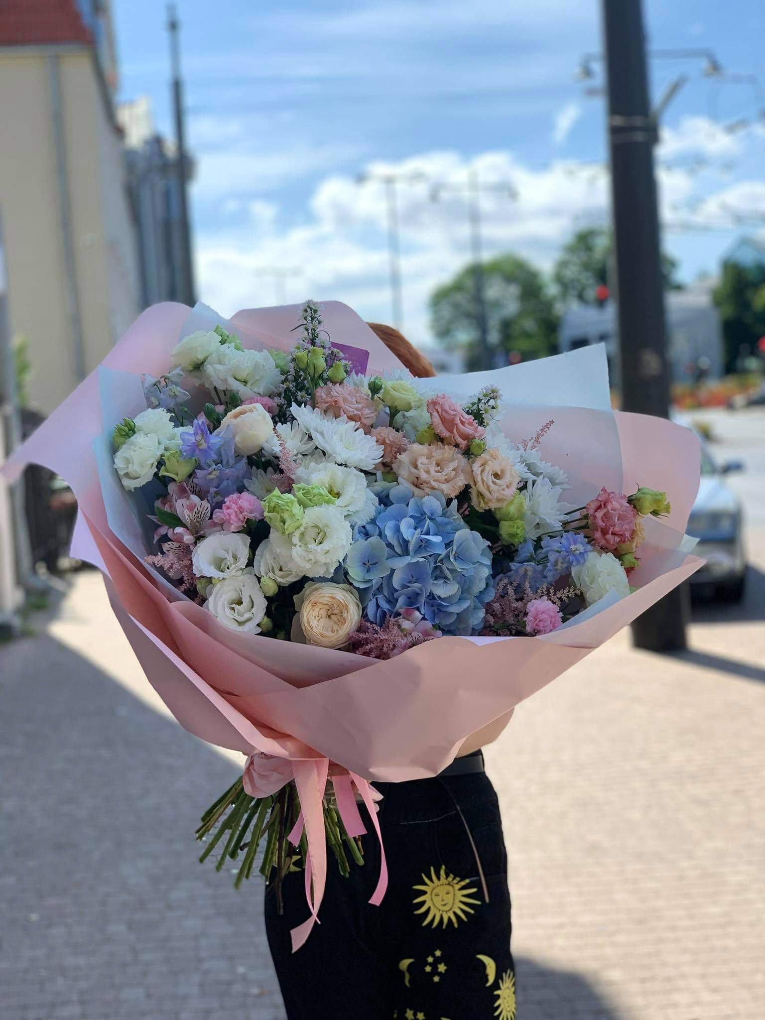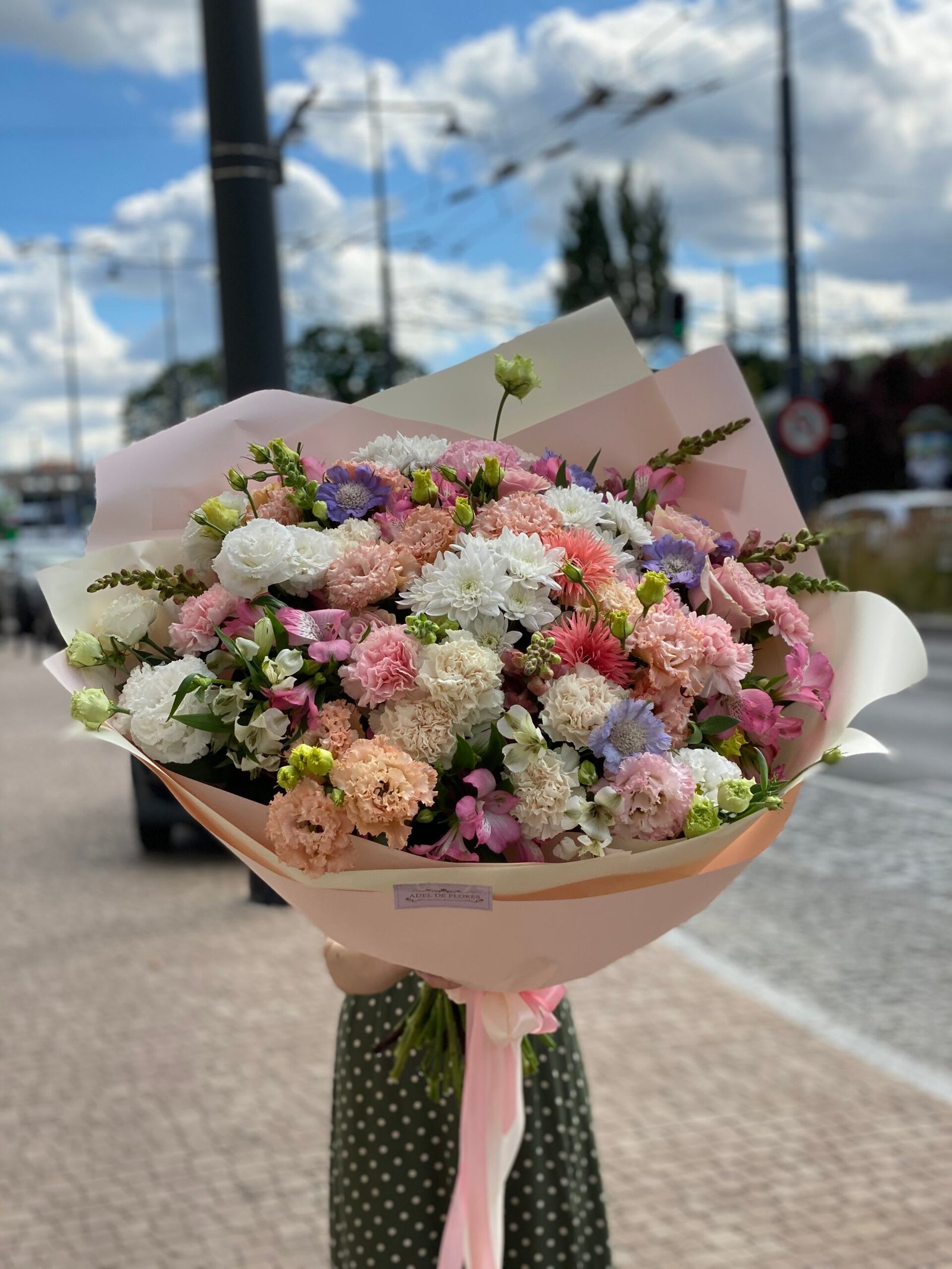 Bogata, pastelowa kompozycja o swobodnym, ogrodowym charakterze. Delikatne odcienie różu, kremu i bieli przełamane subtelnymi akcentami lawendy tworzą świeży, lekki bukiet pełen naturalnej energii. Różnorodność faktur i kształtów nadaje całości artystycznego wyrazu, a jasne, eleganckie opakowanie pięknie podkreśla kolorystykę kwiatów. Idealny wybór na urodziny, imieniny, gratulacje lub jako radosny prezent bez okazji.