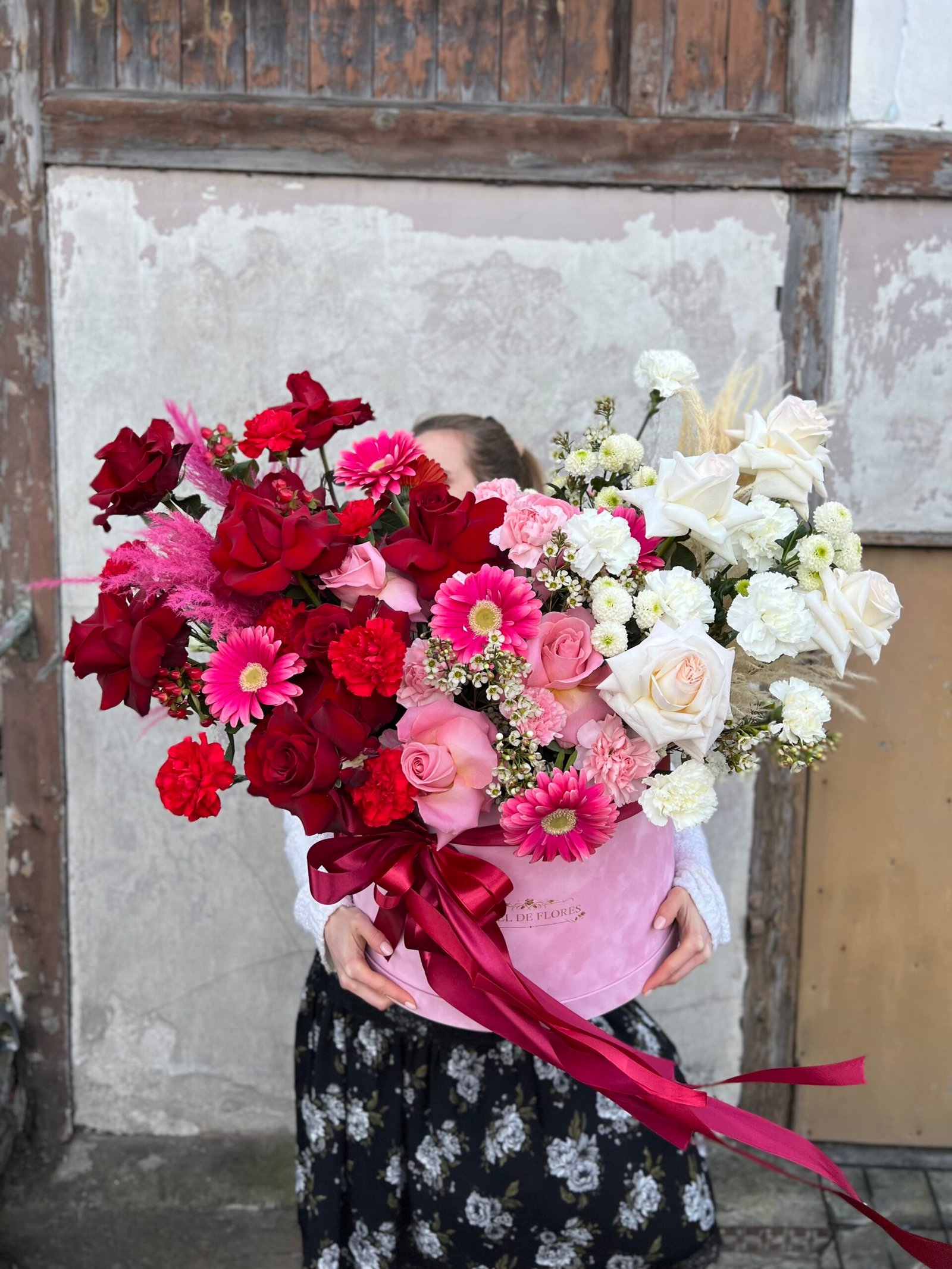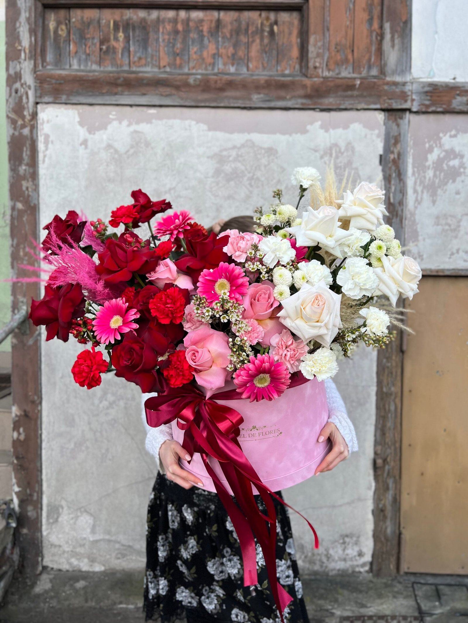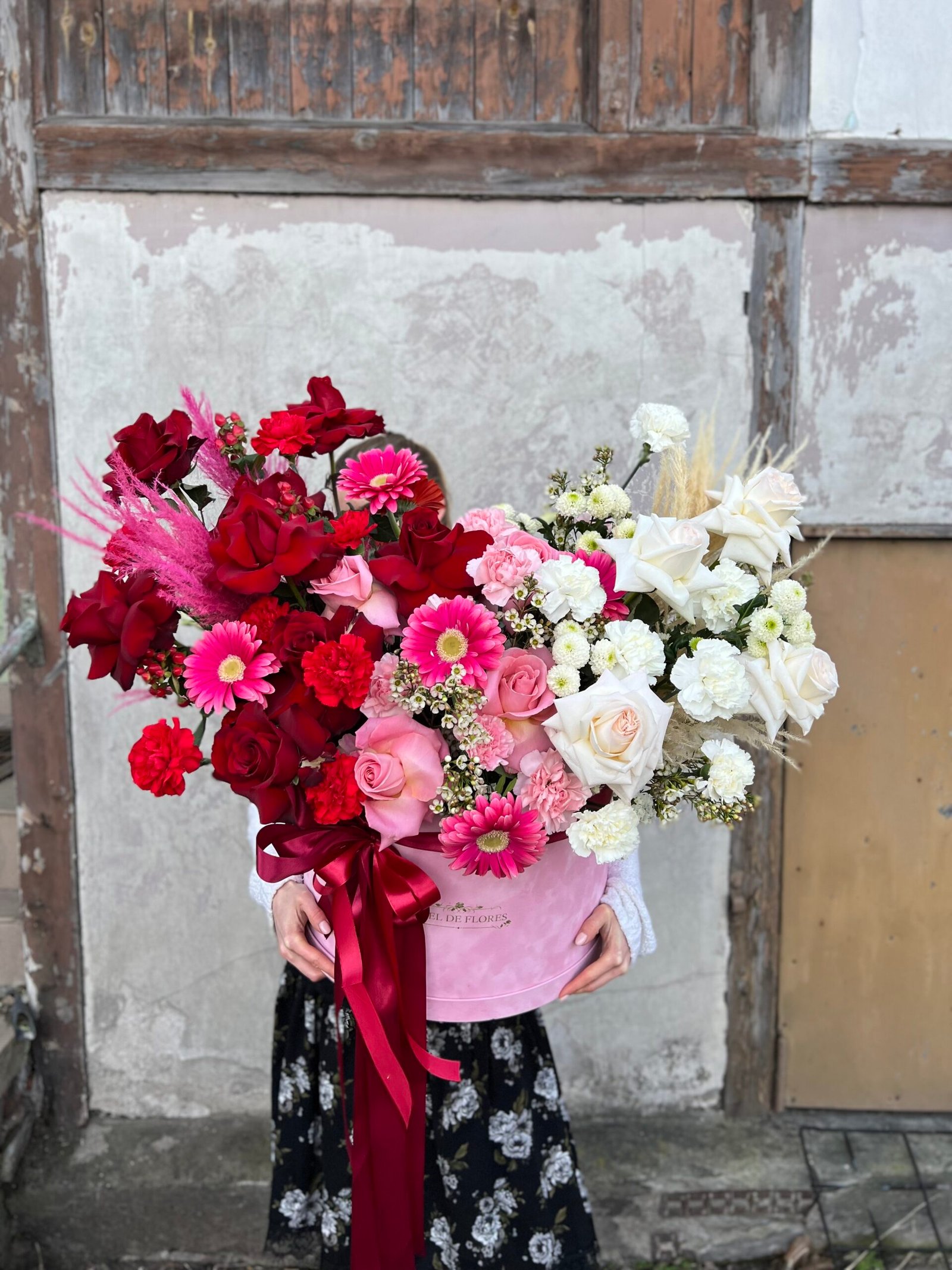 Efektowna, bogata kompozycja w formie flowerboxa, łącząca intensywne czerwienie z pudrowymi różami i elegancką bielą. Zestawienie różnych faktur i kolorów tworzy wyrazisty, a jednocześnie harmonijny bukiet o luksusowym charakterze. To propozycja idealna na wyjątkowe okazje — urodziny, rocznicę, Walentynki lub jako spektakularny prezent, który robi natychmiastowe wrażenie. Całość prezentuje się bardzo obficie i butikowo, kompozycja może się różnic ale kolorystyka zostanie zachowana.