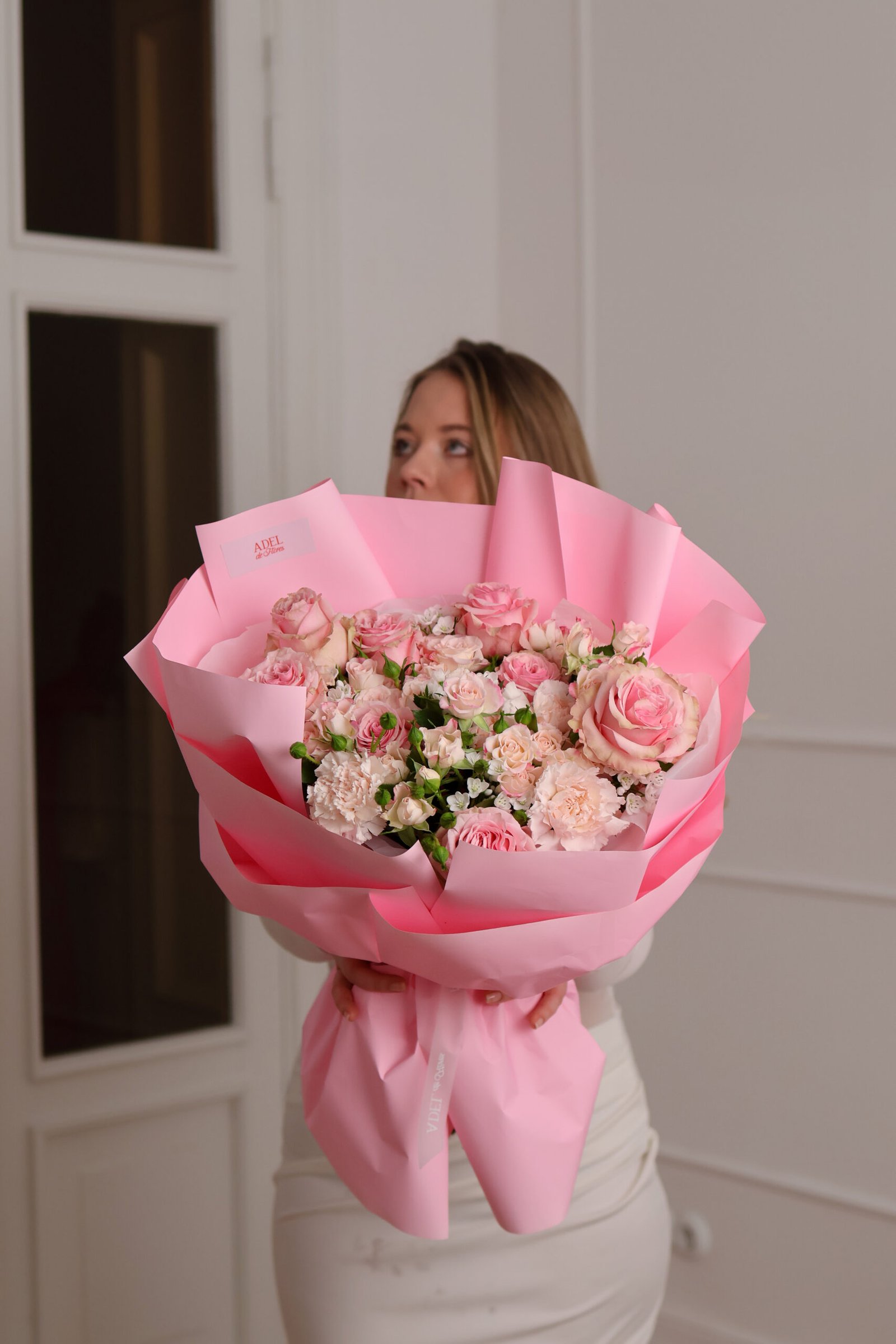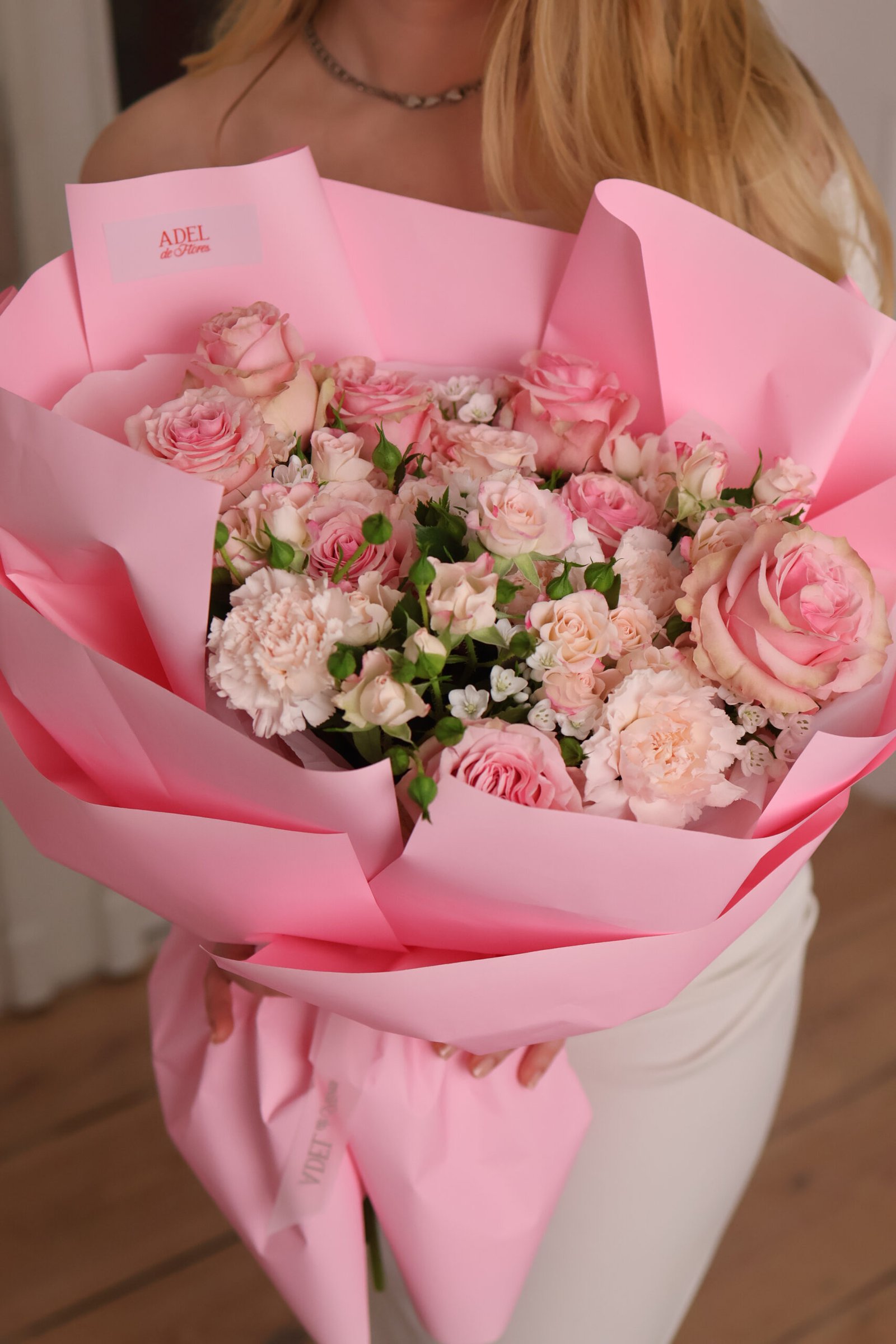 Delikatny bukiet pełen uroku, w którym królują subtelne, różowe róże przełamane koronkowymi goździkami. To kompozycja, która mówi: «Myślę o Tobie» – idealna na dowód sympatii, urodziny lub bez okazji, by wywołać uśmiech.