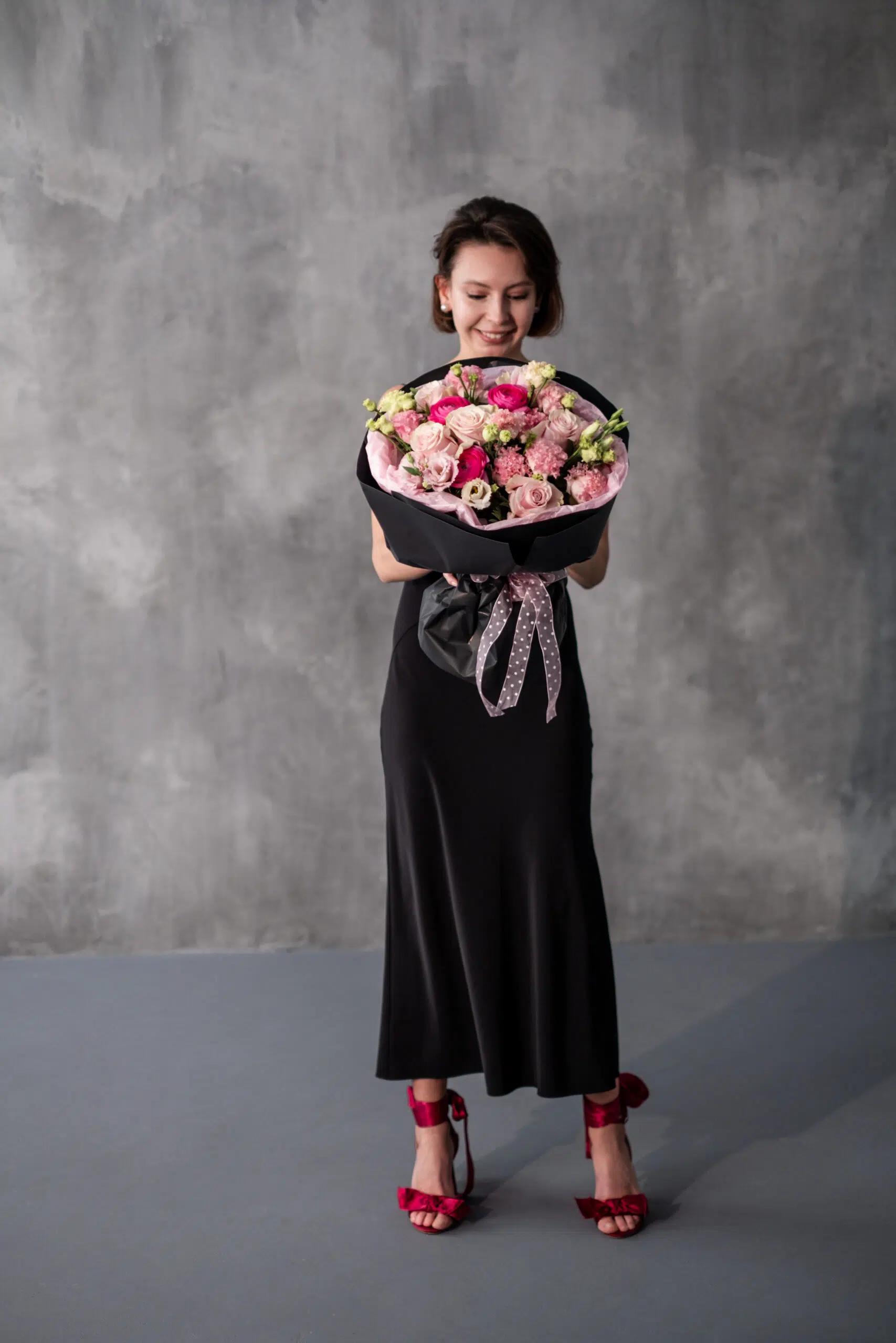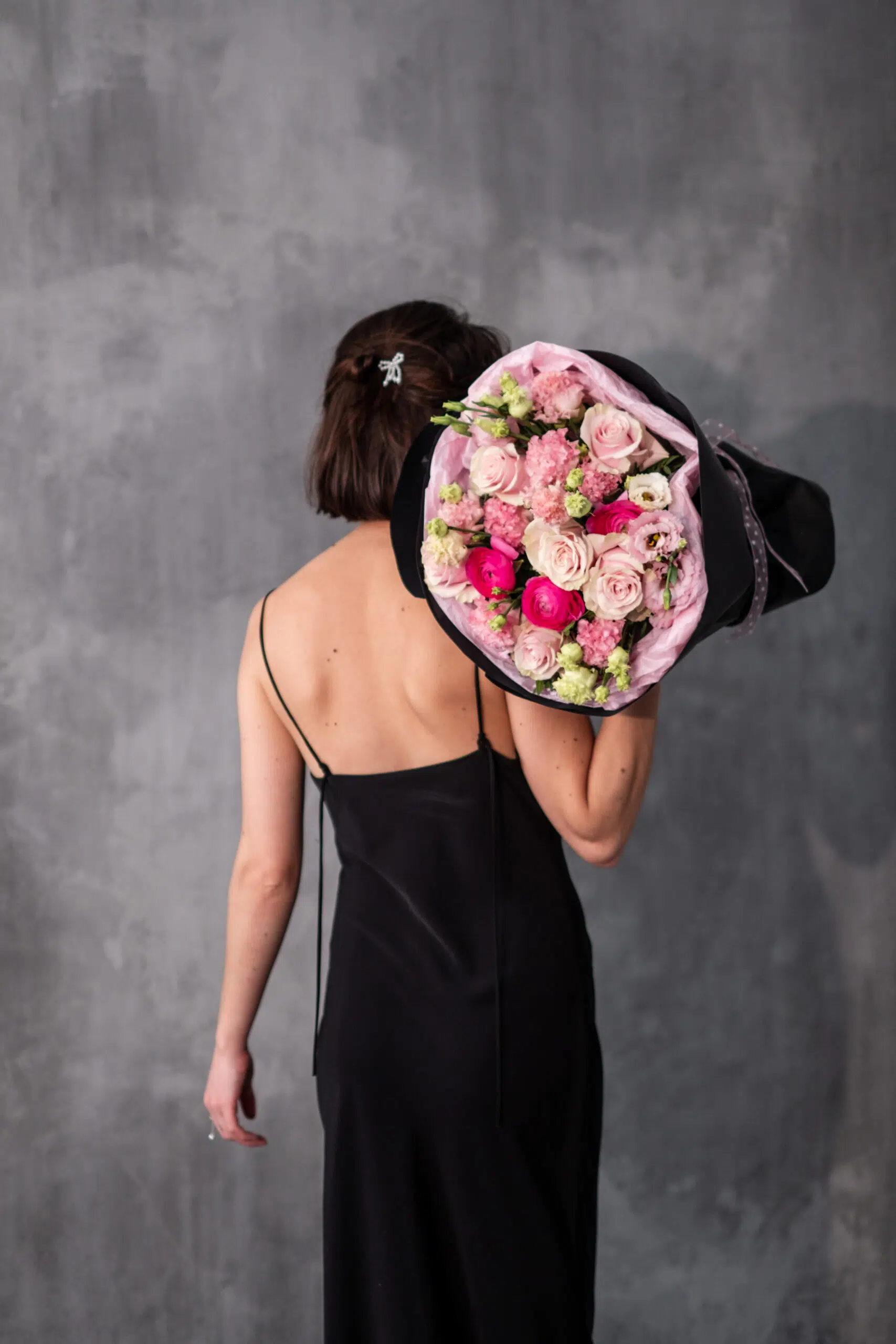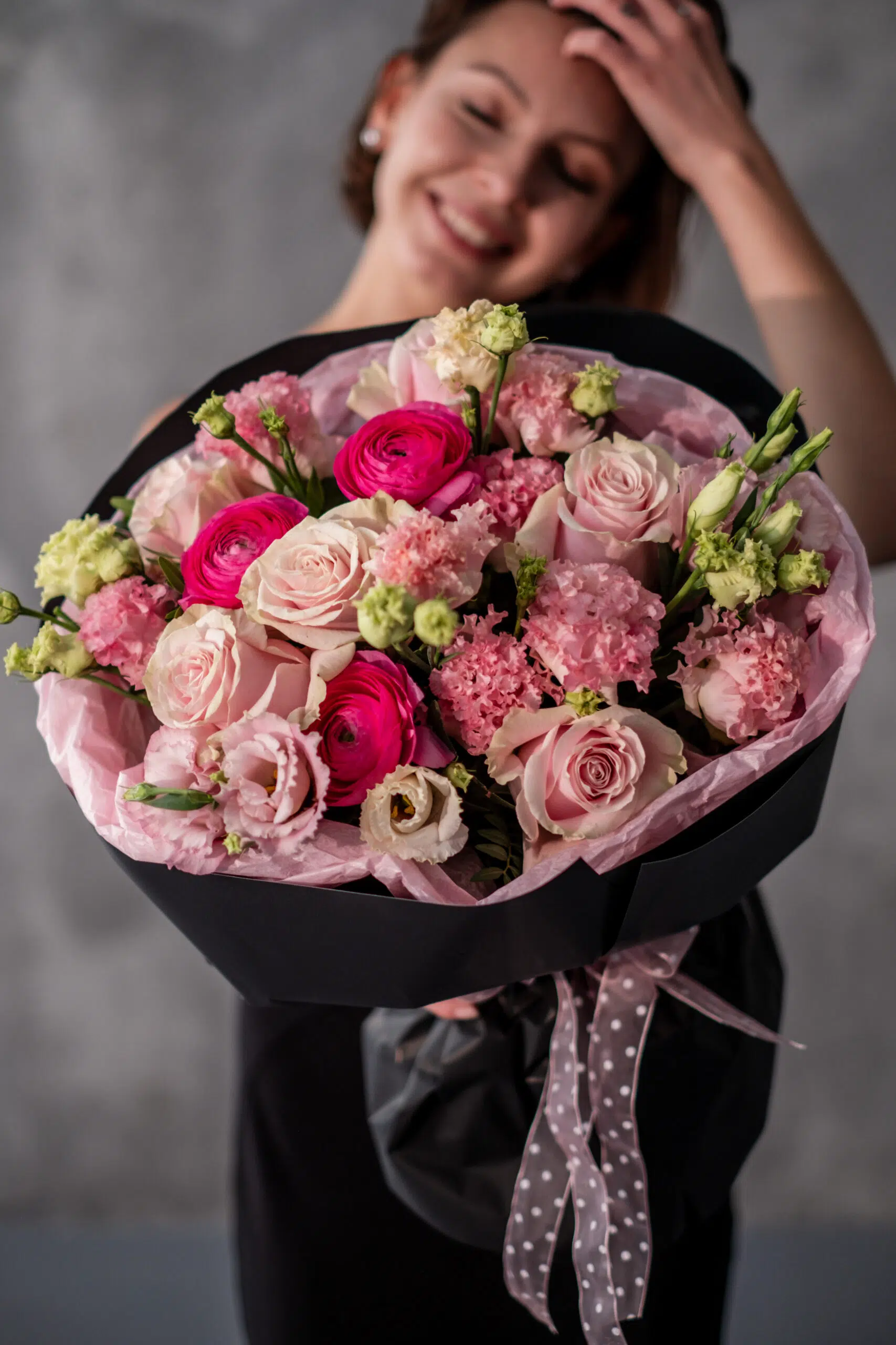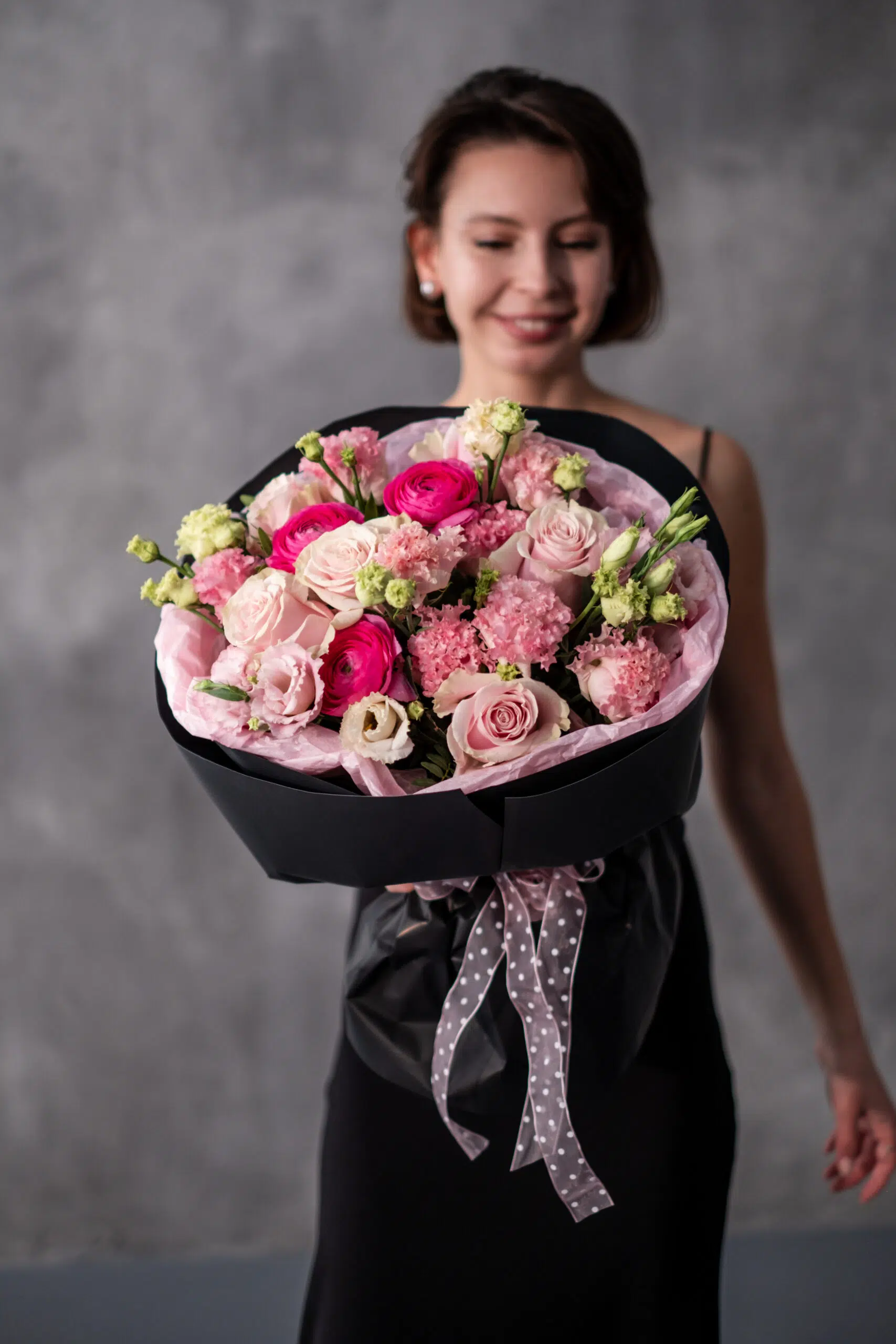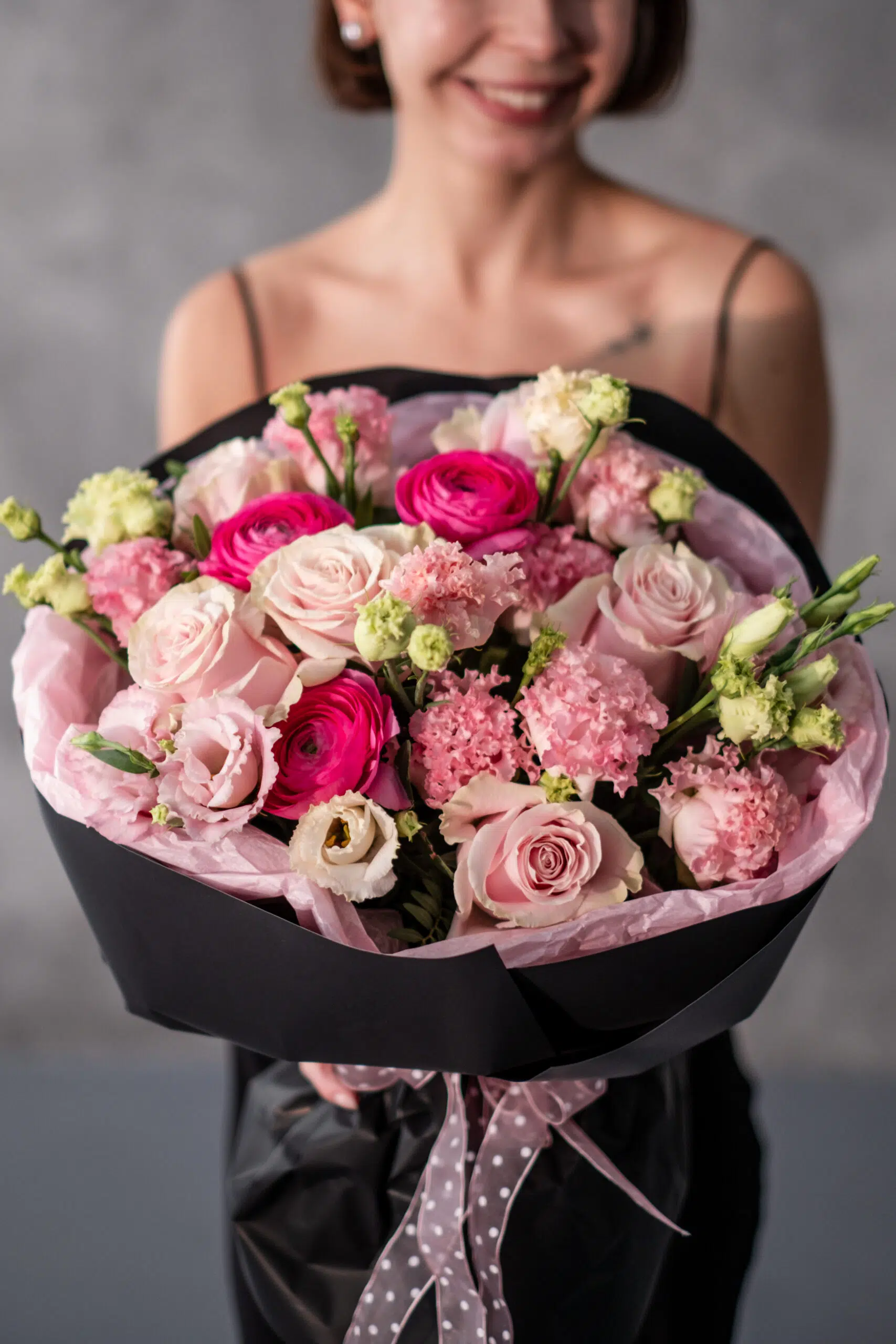 Romantyczna, wielokwiatowa kompozycja utrzymana w pudrowo-różowej palecie, łącząca klasyczne róże z delikatną eustomą, fakturalnymi goździkami oraz jaskrami. Zróżnicowane formy i miękkie odcienie tworzą lekki, nowoczesny bukiet o bardzo kobiecym charakterze. To doskonały wybór na urodziny, rocznicę, Walentynki lub jako elegancki prezent bez okazji. Opakowanie może się różnić w zależności od dostępności, zawsze zachowując spójny, butikowy styl.