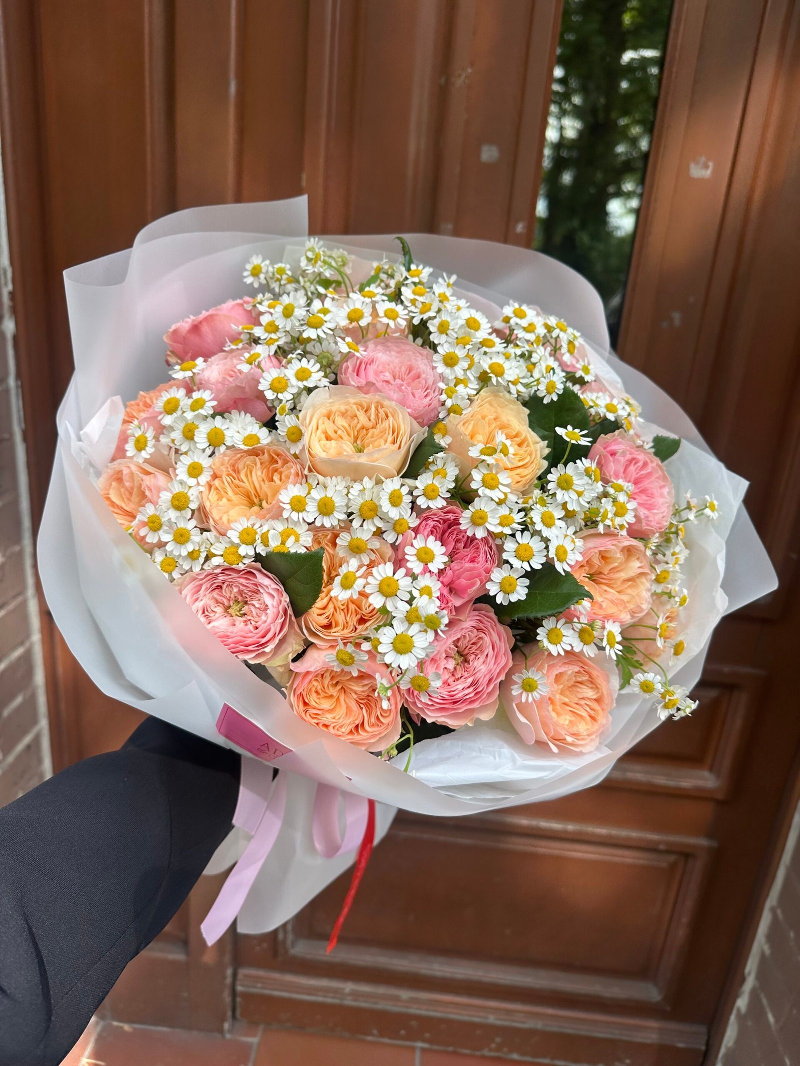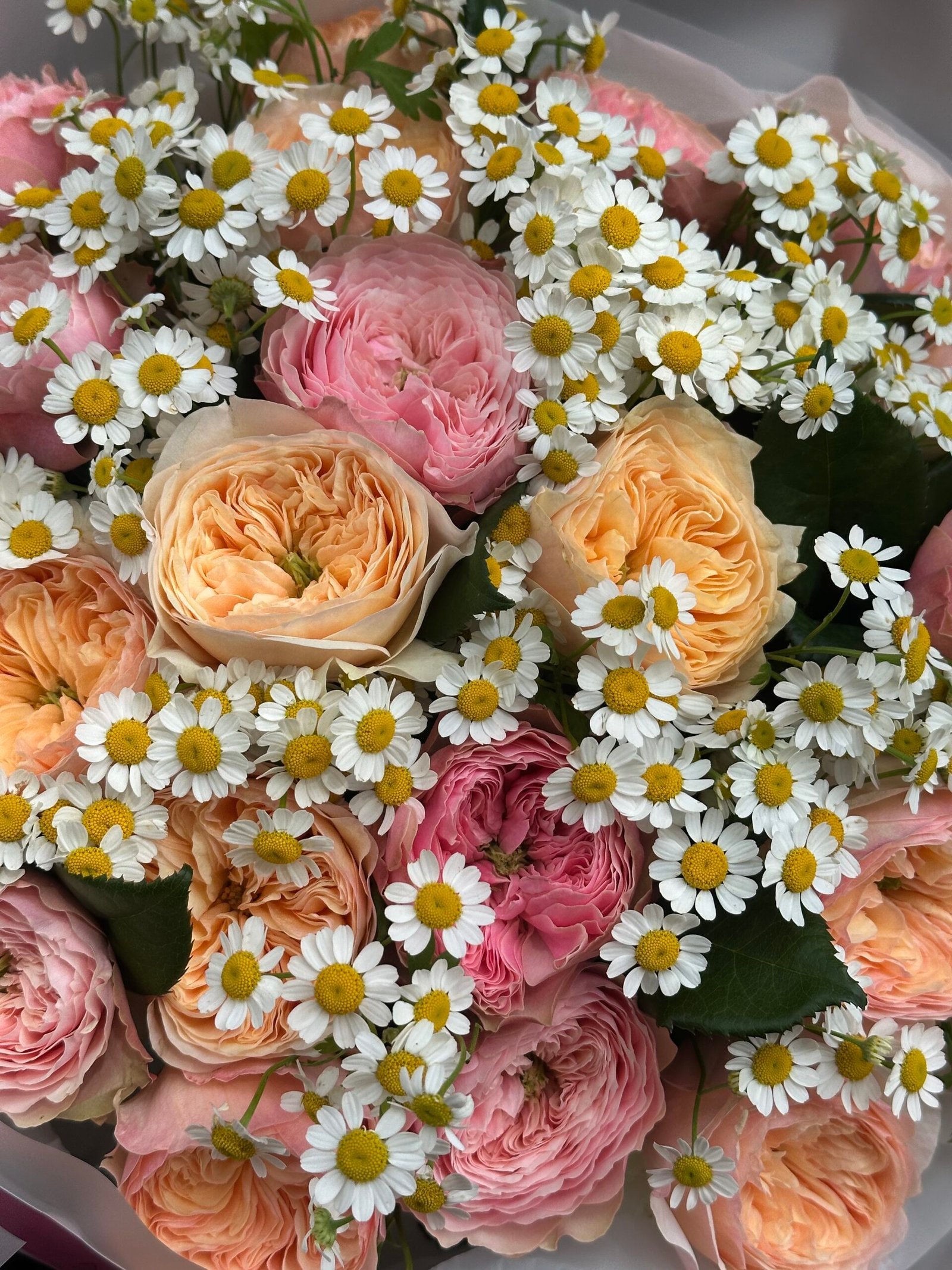 Delikatna, romantyczna kompozycja, w której pełne objętości róże piwoniowe w odcieniach różu i brzoskwini tworzą miękką, luksusową podstawę, a drobny rumianek wprowadza lekkość i naturalny, urokliwy akcent. Bukiet emanuje świeżością i subtelnością, idealny na wyjątkowe chwile pełne ciepła i szczerych uczuć.