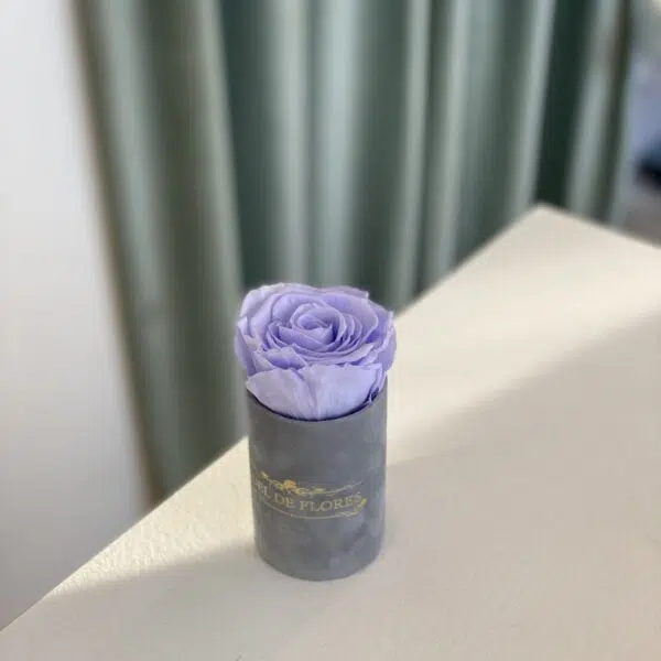 Pojedyncza lawendowa wieczna róża w szarym pudełku