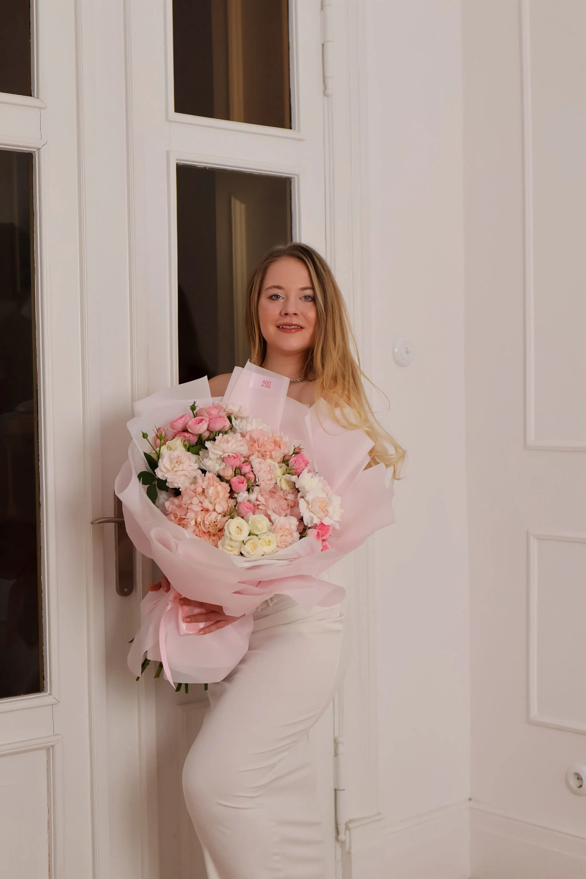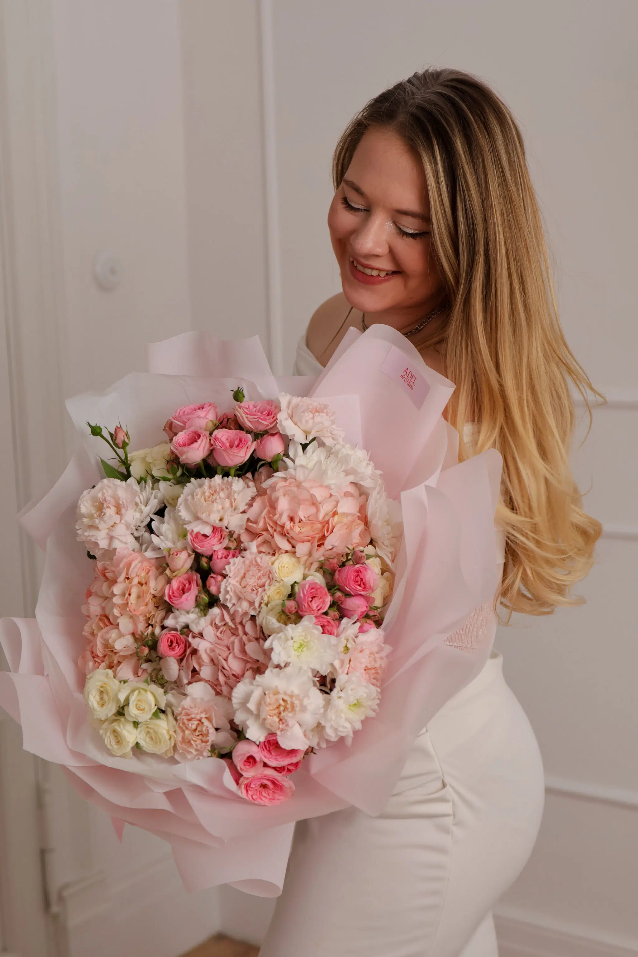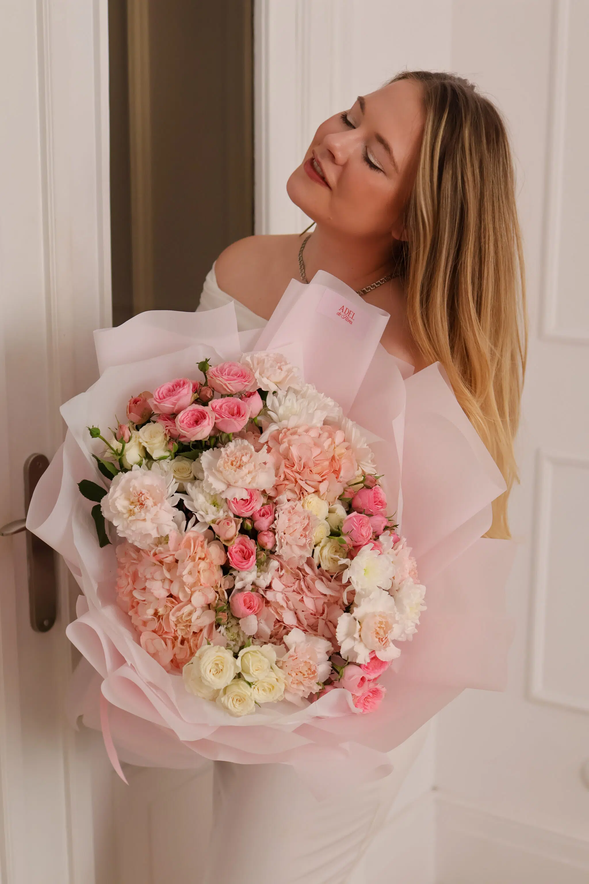 Bukiet pełen lekkości i ogrodowego uroku. Puszyste hortensje spotykają się tu z delikatnymi różami krzewiastymi i koronkowymi goździkami. To kompozycja, która tętni życiem – idealna, by wyrazić bezgraniczną wdzięczność lub zachwyt.