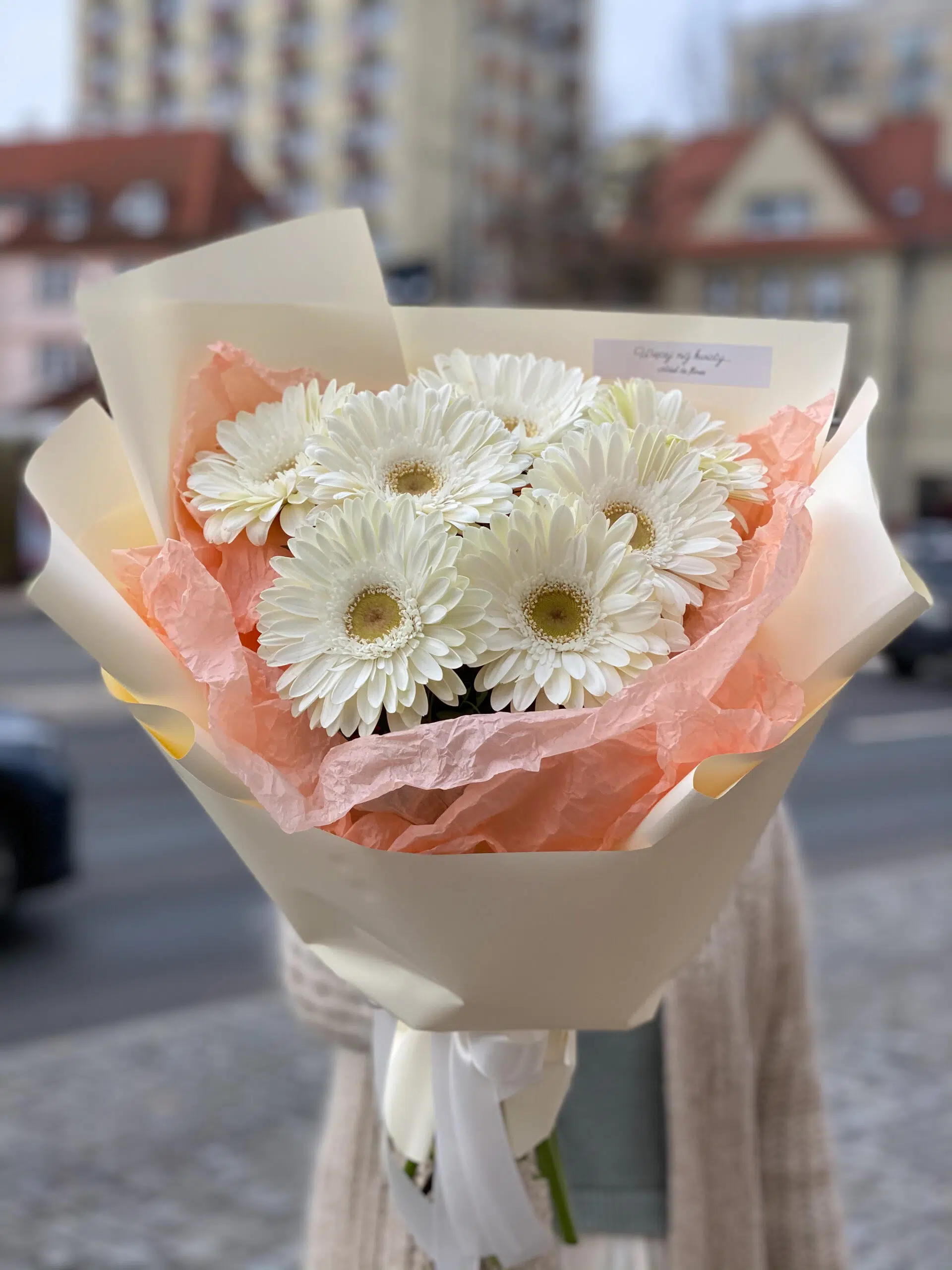 Bukiet z białych gerber w eleganckim wodoodpornym opakowaniu.