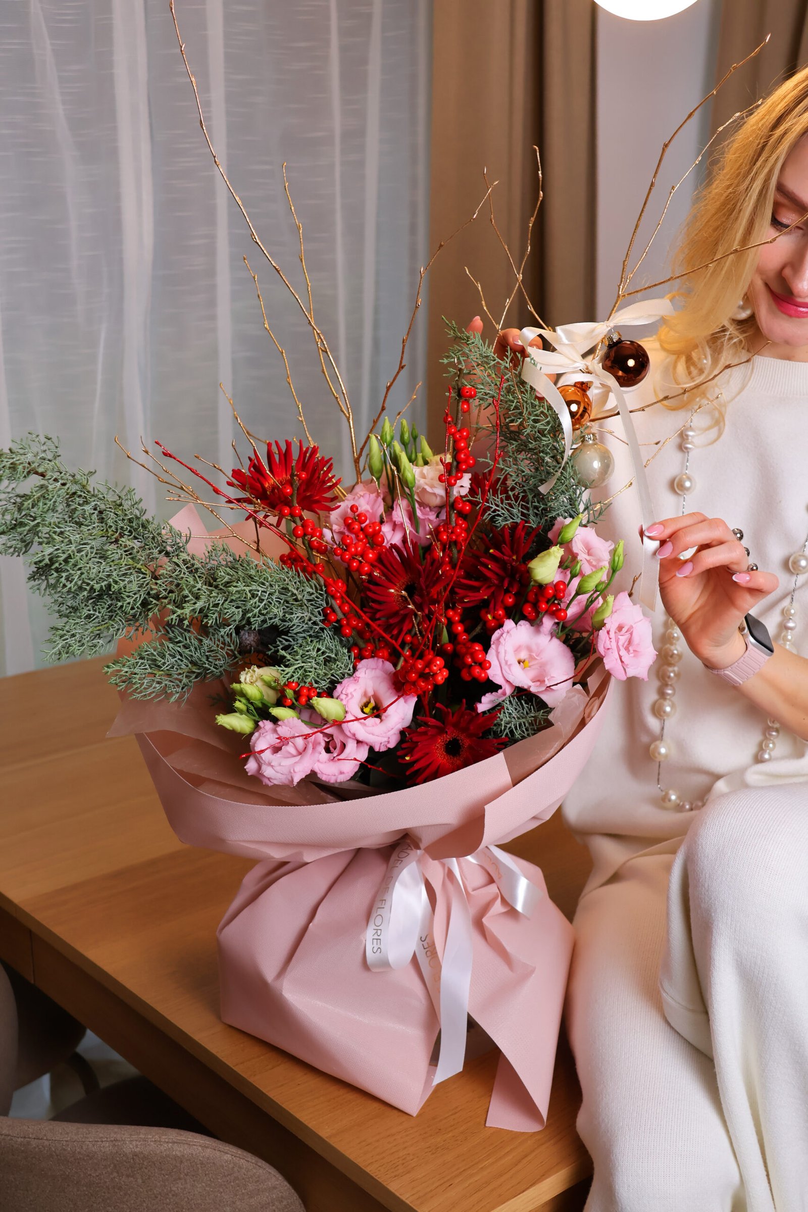 Opakowany w pudroworóżowy papier i przewiązany satynową wstążką, bukiet prezentuje się wyjątkowo szykownie — idealny jako prezent na świąteczny czas, zimowe urodziny lub każdą okazję, która wymaga odrobiny efektownego uroku.