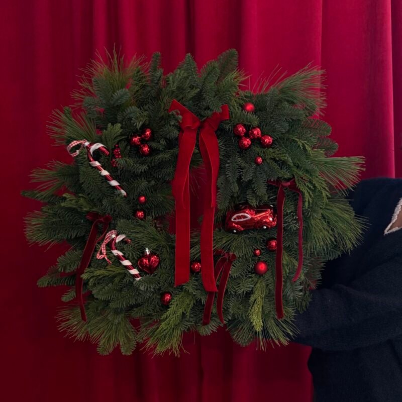 Elegancka i efektowna dekoracja świąteczna, łącząca klasyczne piękno z odrobiną blasku. Złoty świecznik stanowi centralny element kompozycji, a wianek dodaje naturalnego uroku.