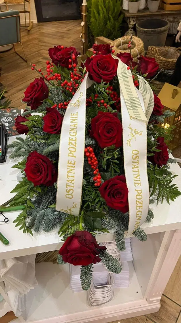 Wiązanka pogrzebowa z różami w kolorze czerwonym, na naturalnym igliwiu.
