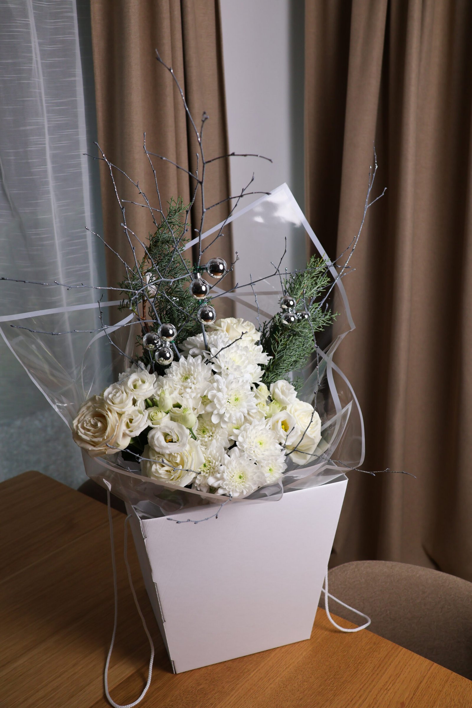 Subtelna, pełna klasy kompozycja, która zachwyca swoją spokojną, zimową elegancją. Bukiet łączy w sobie kremowe róże, delikatne pąki eustomy oraz śnieżnobiałe chryzantemy, tworząc harmonijną i miękką paletę barw. Zielone gałązki cyprysa wprowadzają świeżość, a srebrne dekoracje i malowane gałązki dodają całości lodowego blasku, przypominając o magicznej atmosferze zimowych świąt.